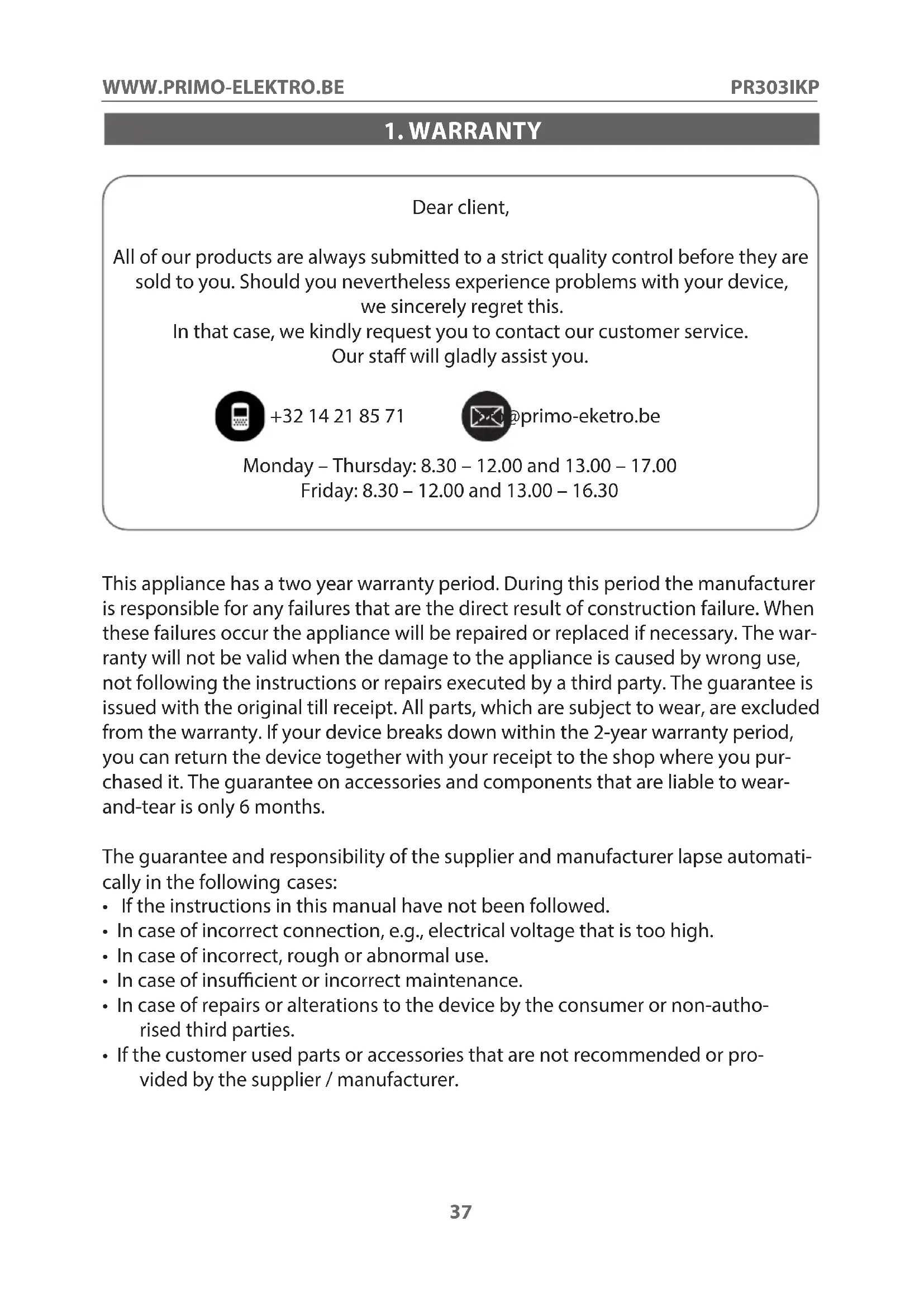 Dear client, All of our products are always submitted to a strict quality control before they are sold to you. Should you nevertheless experience problems with your device, we sincerely regret this. In that case, we kindly request you to contact our customer service. Our sta will gladly assist you. +32 14 21 85 71 info@primo-eketro.be Monday – Thursday: 8.30 – 12.00 and 13.00 – 17.00 Friday: 8.30 – 12.00 and 13.00 – 16.30