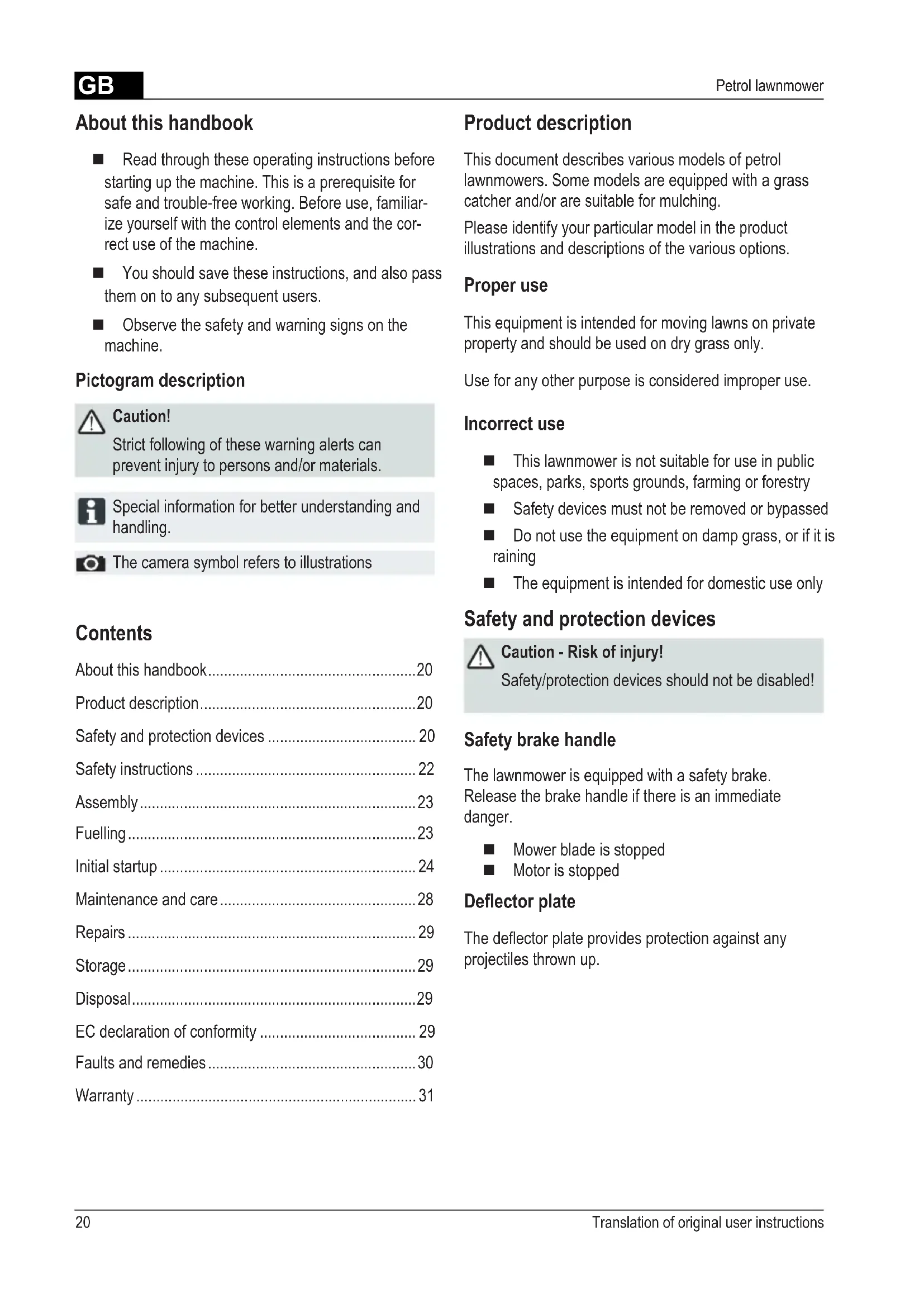 - Warranty About this handbook Read through these operating instructions before starting up the machine. This is a prerequisite for safe and trouble-free working. Before use, familiar- ize yourself with the control elements and the cor- rect use of the machine. You should save these instructions, and also pass them on to any subsequent users. Observe the safety and warning signs on the machine. Pictogram description Caution! Strict following of these warning alerts can prevent injury to persons and/or materials. Special information for better understanding and handling. The camera symbol refers to illustrations Product description This document describes various models of petrol lawnmowers. Some models are equipped with a grass catcher and/or are suitable for mulching. Please identify your particular model in the product illustrations and descriptions of the various options. Proper use This equipment is intended for moving lawns on private property and should be used on dry grass only. Use for any other purpose is considered improper use. Incorrect use This lawnmower is not suitable for use in public spaces, parks, sports grounds, farming or forestry Safety devices must not be removed or bypassed Do not use the equipment on damp grass, or if it is raining The equipment is intended for domestic use only Safety and protection devices Caution - Risk of injury! Safety/protection devices should not be disabled! Safety brake handle The lawnmower is equipped with a safety brake. Release the brake handle if there is an immediate danger. Mower blade is stopped Motor is stopped Deector plate Thedeectorplateprovidesprotectionagainstany projectiles thrown up.GB p. 31