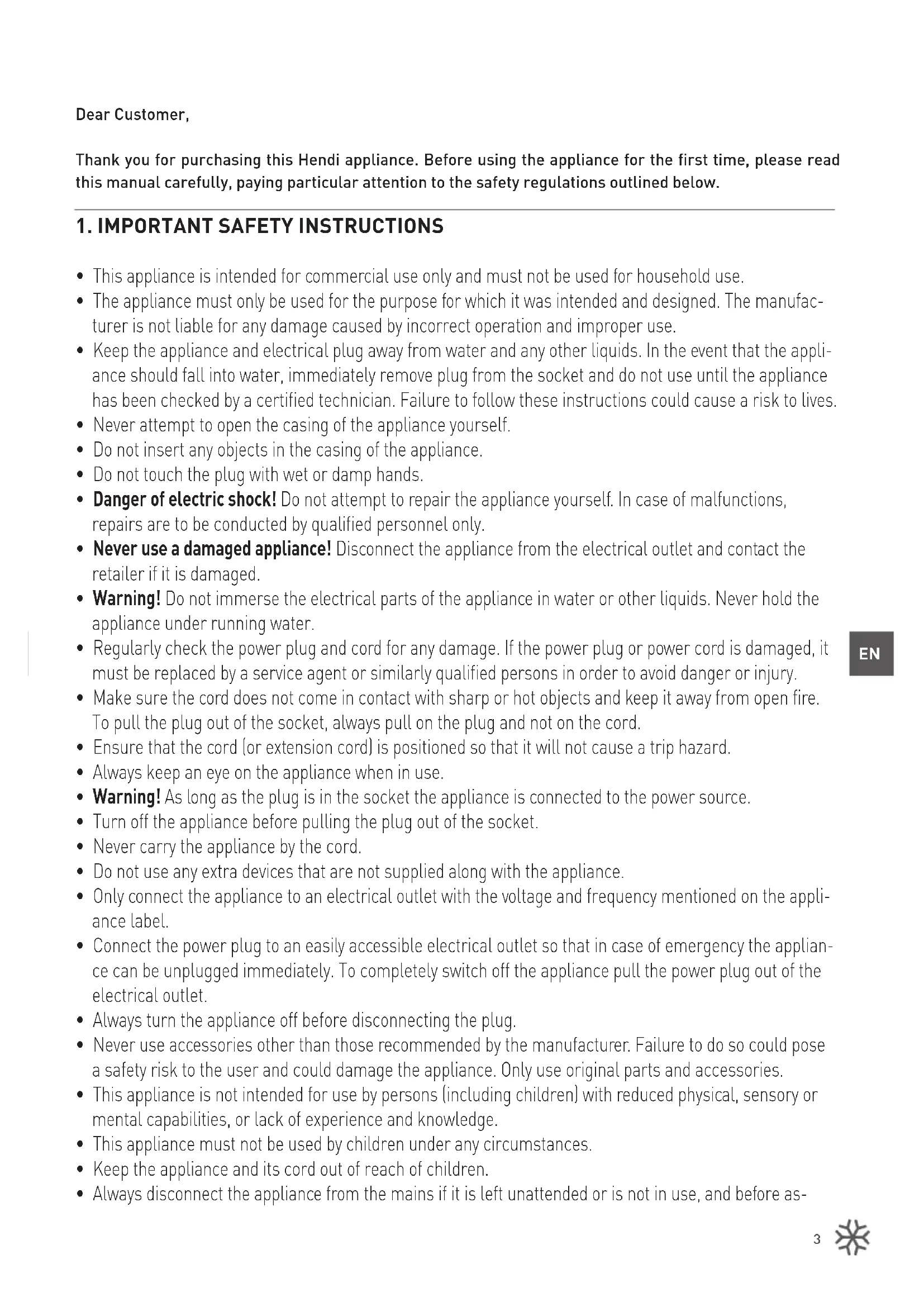 Dear Customer, Thank you for purchasing this Hendi appliance. Before using the appliance for the first time, please read this manual carefully, paying particular attention to the safety regulations outlined below.