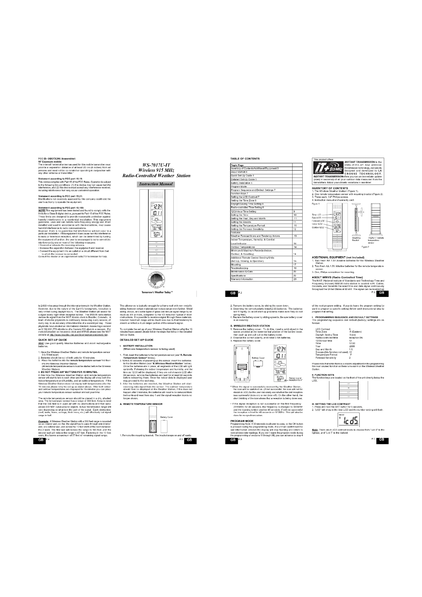 Topic PageInventory of Contents/Additional Equipment 3About WWVB 3Quick Set-Up Guide 4Detailed Set-Up Guide 5Battery installation 5Program ModeProgram Sequence and Default Settings 7Function Keys 7Setting the LCD Contrast 7Setting the Time Zone 8Daylight Saving Time Setting 8Radio-controlled Time Setting 912/24-hour Time Setting 9Setting the Time 10Setting the Year, Day and Month 11Setting the Snooze 11Setting the Temperature Format 11Setting the Forecast Sensitivity 12FeaturesWeather Forecast Icons and Tendency Arrows 13Indoor Temperature, Humidity, & ComfortLevel Indicator 14Outdoor Temperatures 14Minimum & Maximum Records (Indoor,Outdoor, & Resetting) 14Additional Remote Control Sending Units(Set-Up, Viewing, & Operation) 15Mounting 17Troubleshooting 19Maintenance & Care 20Specifications 20Warranty Information 20This product offers: INSTANT TRANSMISSION is thestate-of-the-art new wirelesstransmission technology, exclusivelydesigned and developed by LACROSSE TECHNOLOGY. INSTANT TRANSMISSION offers you can an immediate update(every 4 seconds!) of all your outdoor data measured from thetransmitters: follow your climatic variations in real-time!