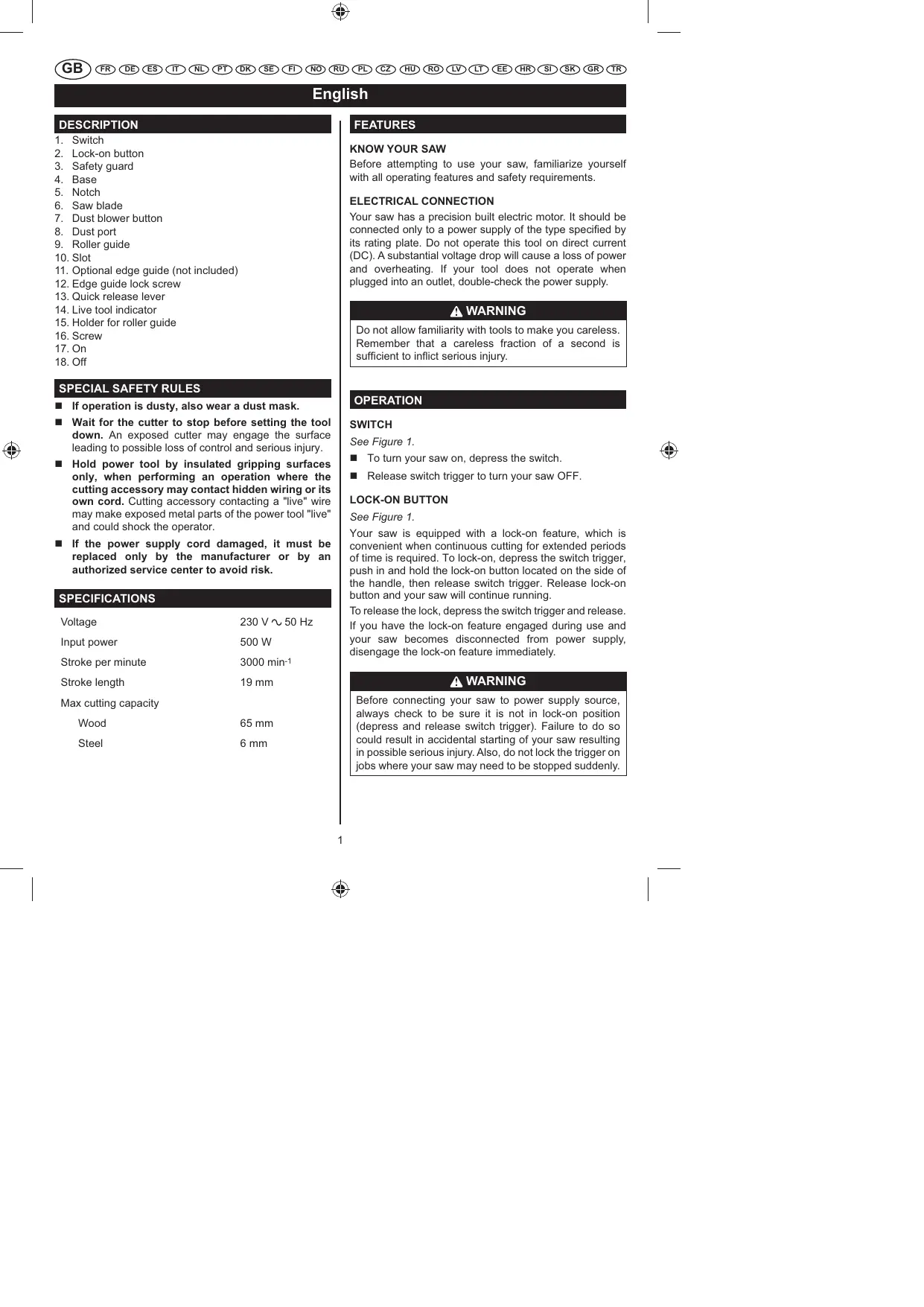 Before attempting to use your saw, familiarize yourself with all operating features and safety requirements. ELECTRICAL CONNECTION Your saw has a precision built electric motor. It should be connected only to a power supply of the type speci>ed by its rating plate. Do not operate this tool on direct current (DC). A substantial voltage drop will cause a loss of power and overheating. If your tool does not operate when plugged into an outlet, double-check the power supply. WARNING Do not allow familiarity with tools to make you careless. Remember that a careless fraction of a second is suf>cient to in?ict serious injury. If operation is dusty, also wear a dust mask. Wait for the cutter to stop before setting the tool down. An exposed cutter may engage the surface leading to possible loss of control and serious injury. SWITCH See Figure 1. To turn your saw on, depress the switch. Hold power tool by insulated gripping surfaces only, when performing an operation where the cutting accessory may contact hidden wiring or its own cord. Cutting accessory contacting a "live" wire may make exposed metal parts of the power tool "live" and could shock the operator. Release switch trigger to turn your saw OFF. LOCK-ON BUTTON See Figure 1. Your saw is equipped with a lock-on feature, which is convenient when continuous cutting for extended periods of time is required. To lock-on, depress the switch trigger, push in and hold the lock-on button located on the side of the handle, then release switch trigger. Release lock-on button and your saw will continue running. To release the lock, depress the switch trigger and release. If you have the lock-on feature engaged during use and your saw becomes disconnected from power supply, disengage the lock-on feature immediately. If the power supply cord damaged, it must be replaced only by the manufacturer or by an authorized service center to avoid risk. SPECIFICATIONS Voltage 230 V 50 Hz Input power 500 W WARNING Before connecting your saw to power supply source, always check to be sure it is not in lock-on position (depress and release switch trigger). Failure to do so could result in accidental starting of your saw resulting in possible serious injury. Also, do not lock the trigger on jobs where your saw may need to be stopped suddenly. Max cutting capacity Wood 65 mm Steel 6 mm