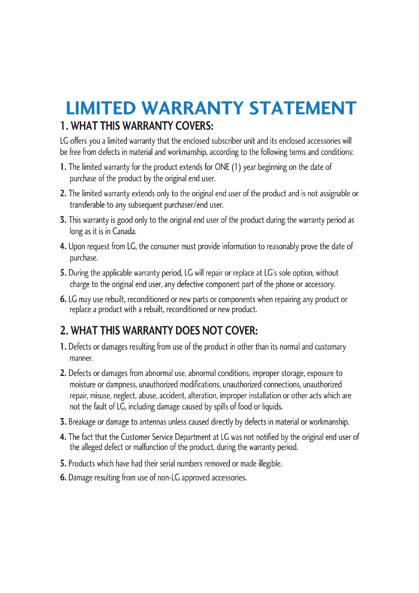 No other express warranty is applicable to this product. THE DURATION OF ANY IMPLIED WARRANTIES, INCLUDING THE IMPLIED WARRANTY OF MARKETABILITY, IS LIMITED TO THE DURATION OF THE EXPRESS WARRANTY HEREIN. LG ELECTRONICS CANADA, INC. SHALL NOT BE LIABLE FOR THE LOSS OF THE USE OF THE PRODUCT, INCONVENIENCE, LOSS OR ANY OTHER DAMAGES, DIRECT OR CONSEQUENTIAL, ARISING OUT OF THE USE OF, OR INABILITY TO USE, THIS PRODUCT OR FOR ANY BREACH OF ANY EXPRESS OR IMPLIED WARRANTY, INCLUDING THE IMPLIED WARRANTY OF MARKETABILITY APPLICABLE TO THIS PRODUCT.
