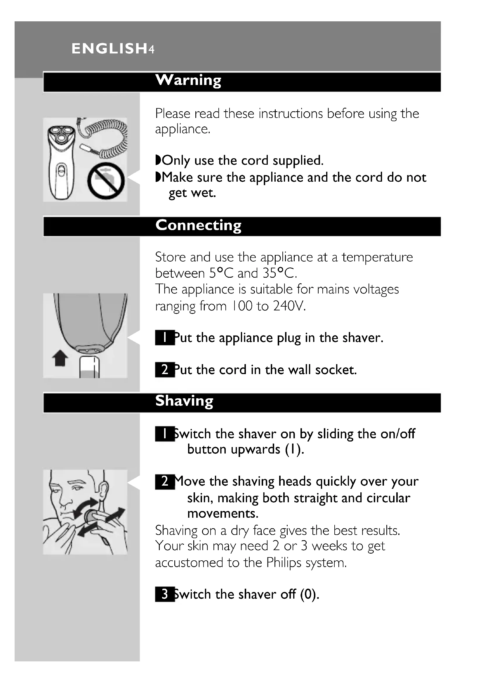 ◗ Make sure the appliance and the cord do not get wet. Connecting Store and use the appliance at a temperature between 5cC and 35cC. The appliance is suitable for mains voltages ranging from 100 to 240V.