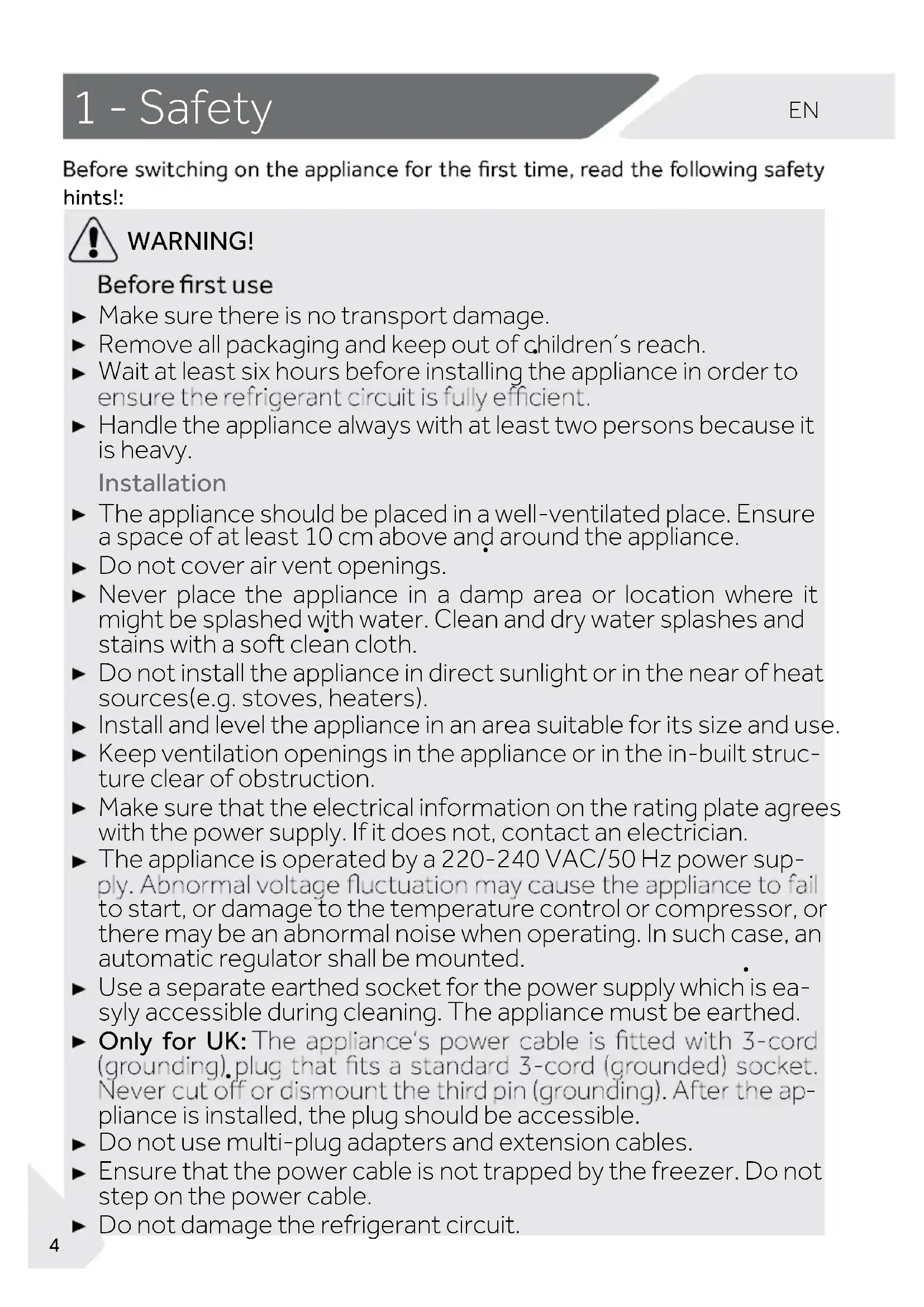 facturer. Maintenance/cleaning Make sure children are supervised if they carry out cleaning and maintenance. Disconnect the appliance from the electrical supply before un dertaking any routine maintenance. Allow at least 5 minutes be fore restarting the appliance, as frequent starting may damage the compressor. Hold the plug, n