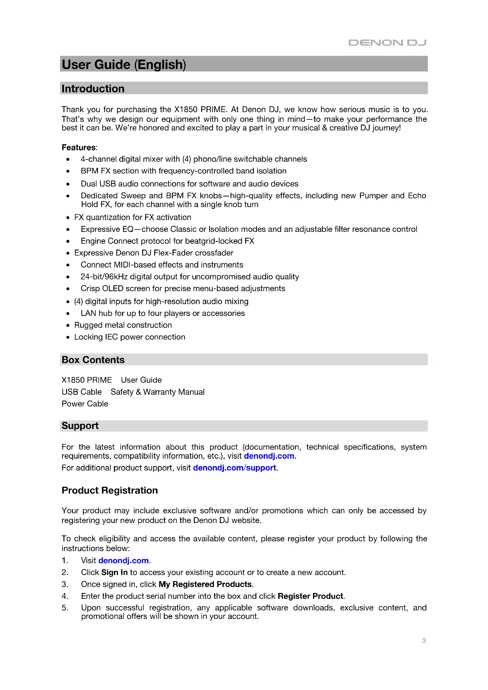- Locking IEC power connection Box Contents X1850 PRIME User Guide USB Cable Safety & Warranty Manual Power Cable Support For the latest information about this product (documentation, technical specifications, system requirements, compatibility information, etc.), visit denondj.com. For additional product support, visit denondj.com/support. Product Registration Your product may include exclusive software and/or promotions which can only be accessed by registering your new product on the Denon DJ website. To check eligibility and access the available content, please register your product by following the instructions below: