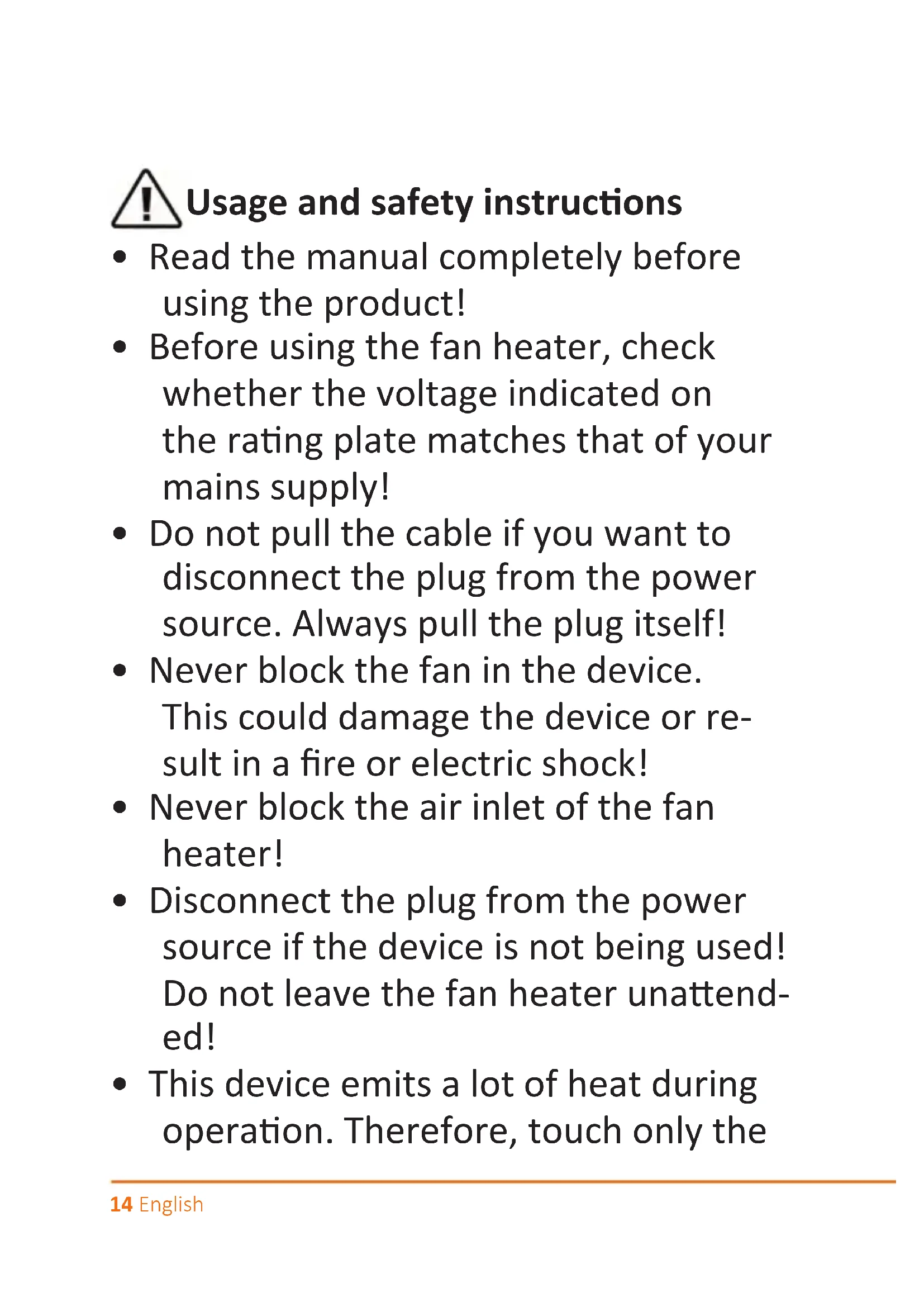- Disconnect the plug from the power source if the device is not being used! Do not leave the fan heater unaend- ed!