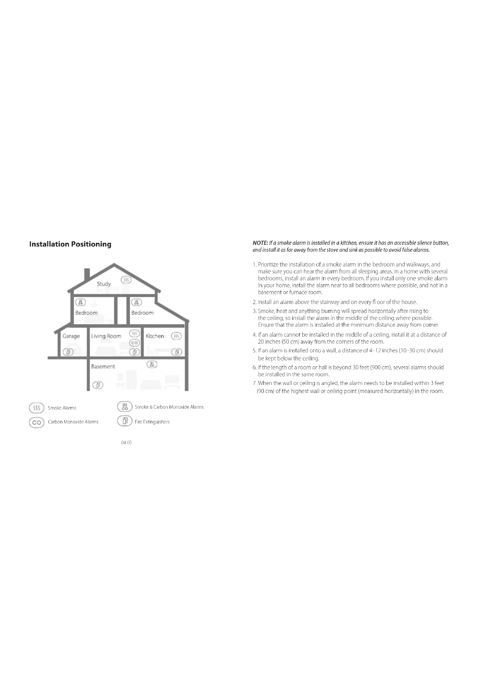 CORRECTLY, REPLACE IT IMMEDIATELY! IF THE ALARM CANNOT WORK PROPERLY, IT WILL NOT ALERT YOU TO A PROBLEM. Low Battery & Malfunction Warning This alarm provides a full audible-visual warning when the battery is low or if there is any malfunction. The alarm beeps once and the red LED indicator fl ashes every 60 seconds when the battery is low. The alarm beeps twice and the red LED indicator fl ashes every 40 seconds when the alarm is in malfunction. Package Contents04 05 Installation Positioning NOTE: If a smoke alarm is installed in a kitchen, ensure it has an accessible silence button, and install it as far away from the stove and sink as possible to avoid false alarms.