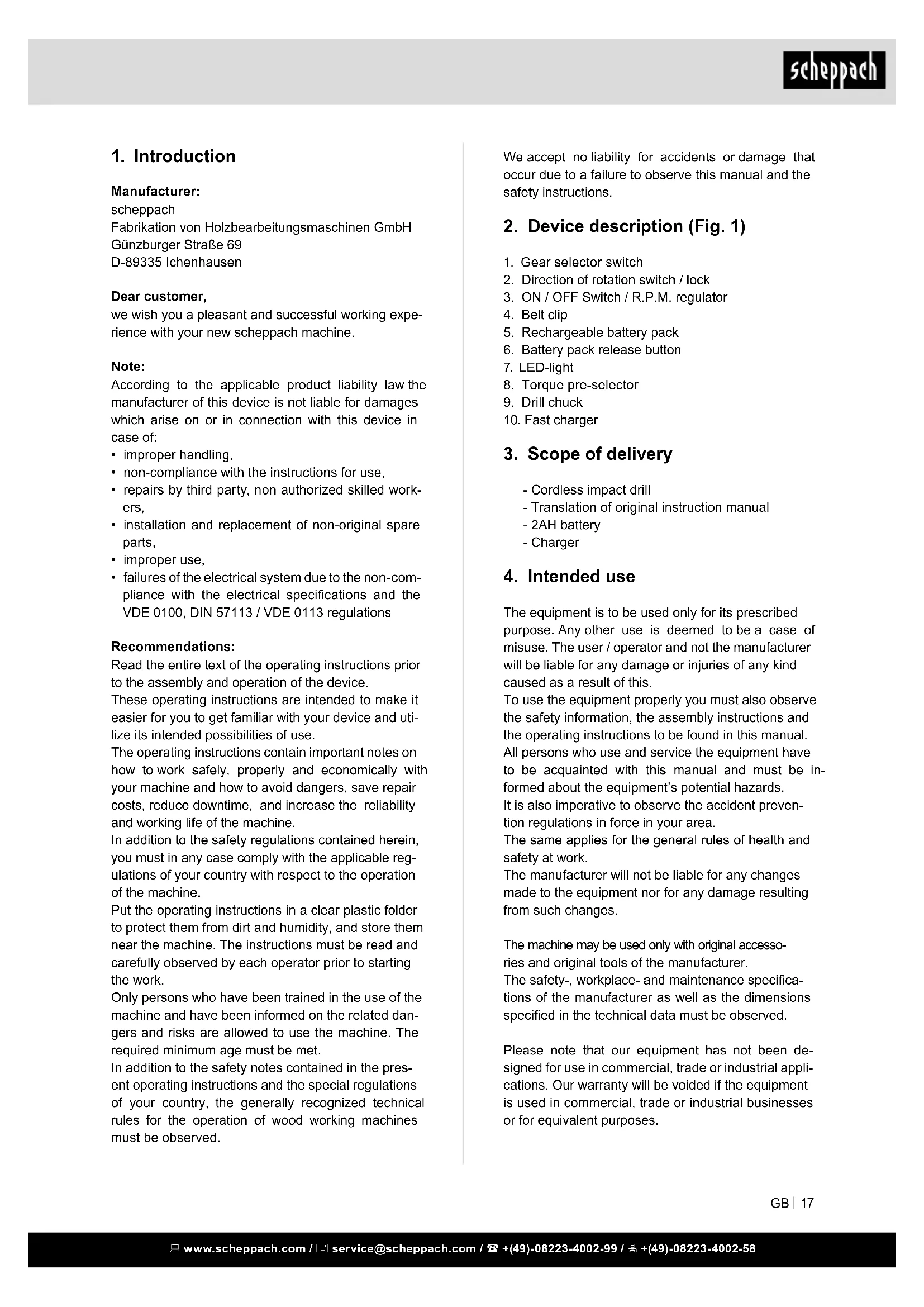 Manufacturer: scheppach Fabrikation von Holzbearbeitungsmaschinen GmbH Günzburger Straße 69 D-89335 Ichenhausen Dear customer, we wish you a pleasant and successful working expe- rience with your new scheppach machine. Note: According to the applicable product liability law the manufacturer of this device is not liable for damages which arise on or in connection with this device in case of: