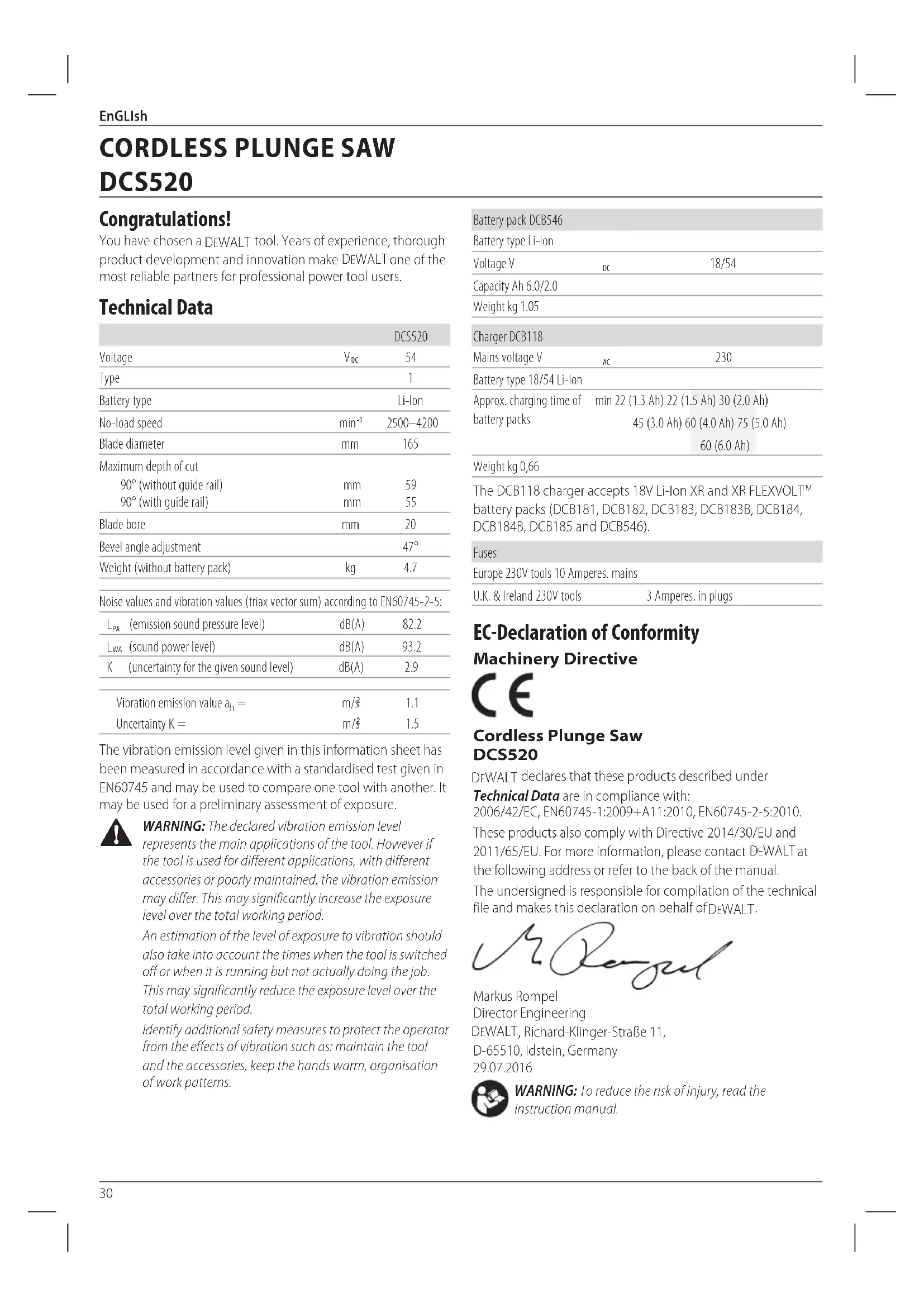 battery packs (DCB181, DCB182, DCB183, DCB183B, DCB184, DCB184B, DCB185 and DCB546). Fuses: Europe 230V tools 10 Amperes. mains U.K. & Ireland 230V tools 3 Amperes. in plugs EC-Declaration of Conformity Machinery Directive Cordless Plunge Saw DCS520 DeWALT declares that these products described under Technical Data are in compliance with: 2006/42/EC, EN60745-1:2009+A11:2010, EN60745-2-5:2010. These products also comply with Directive 2014/30/EU and 2011/65/EU. For more information, please contact DeWALT