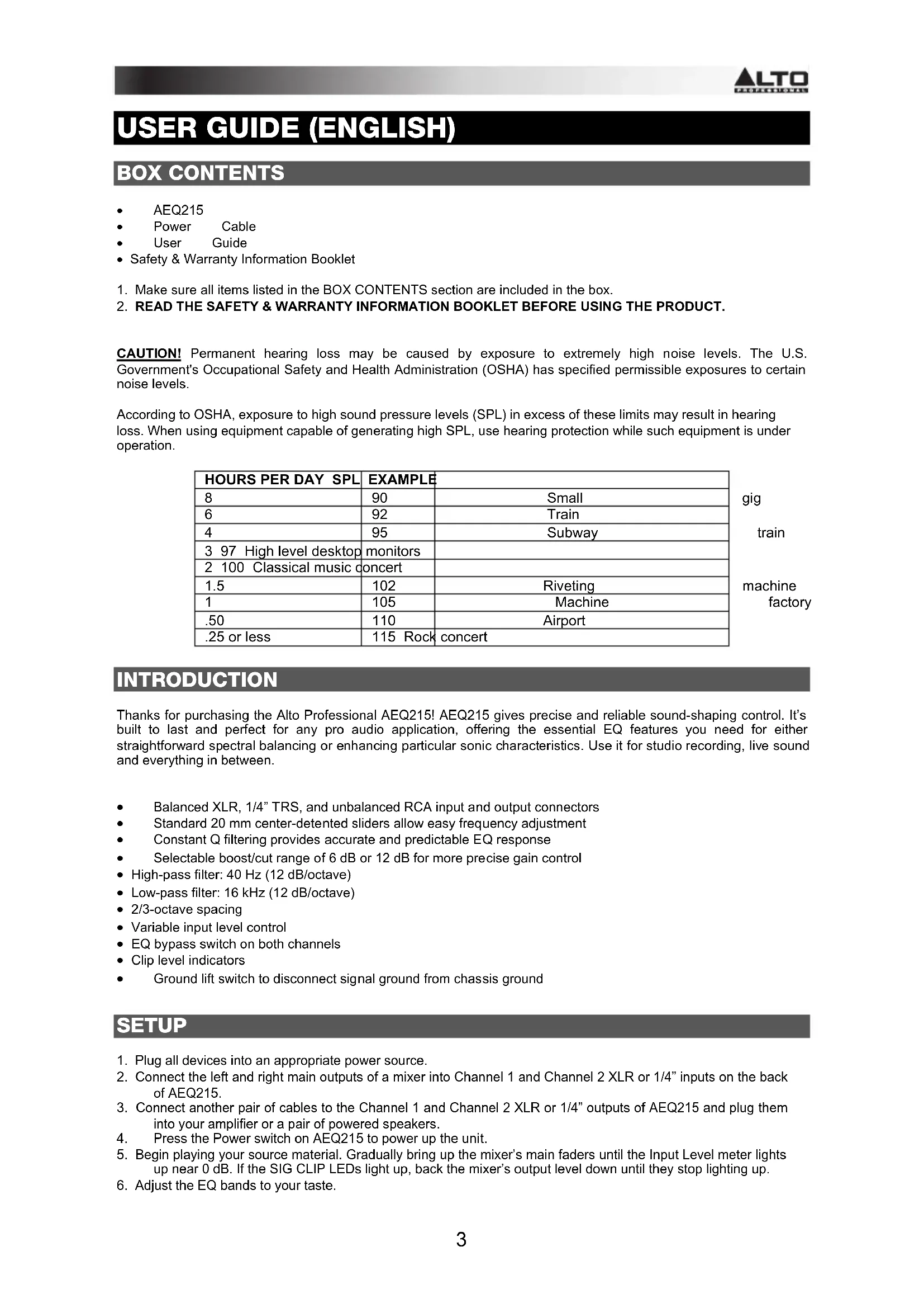 INTRODUCTION Thanks for purchasing the Alto Professional AEQ215! AEQ215 gives precise and reliable sound-shaping control. It’s built to last and perfect for any pro audio application, offering the essential EQ features you need for either straightforward spectral balancing or enhancing particular sonic characteristics. Use it for studio recording, live sound and everything in between.