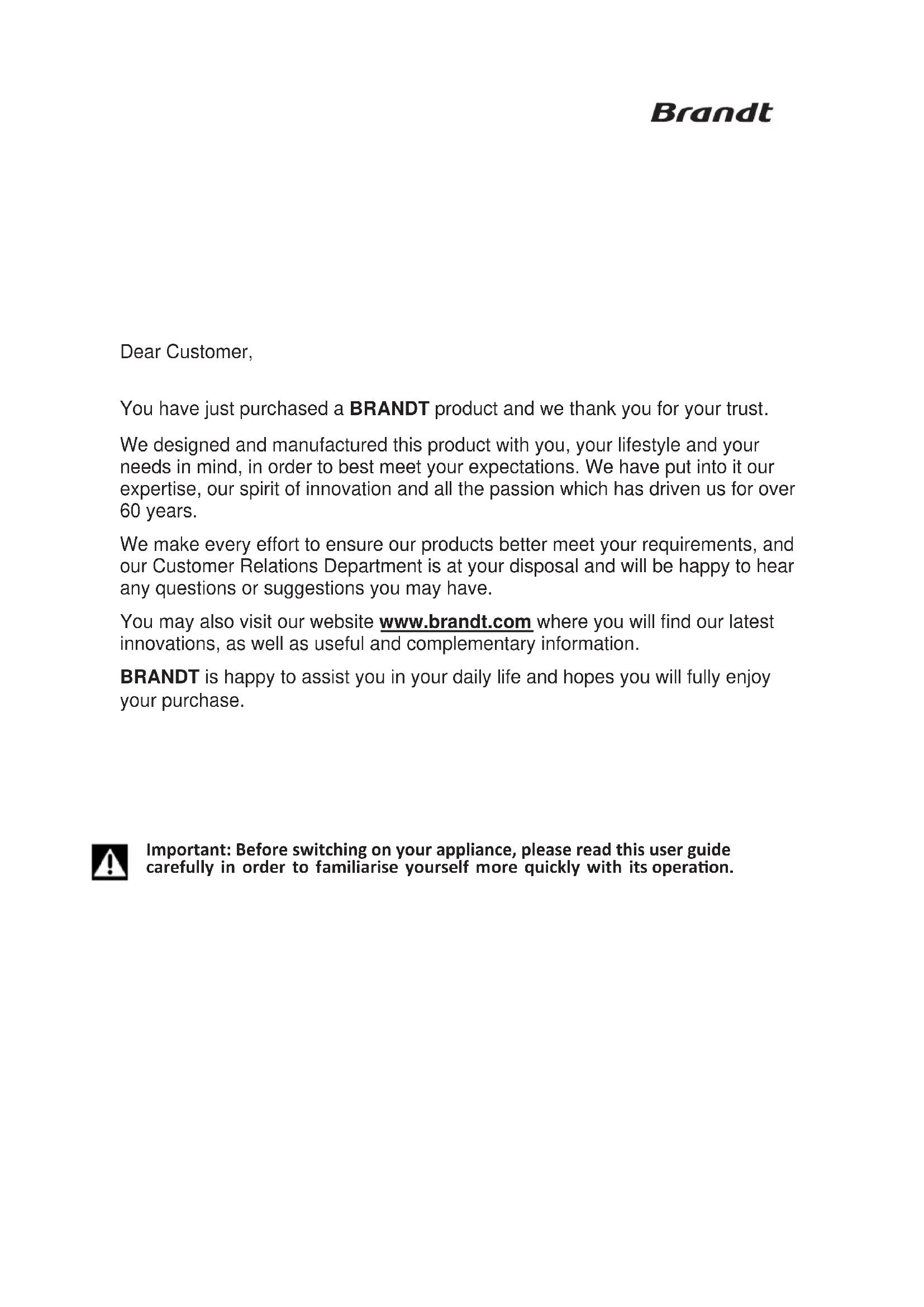 You can find a list of approved service centres on our website www.brandt.com This website also allows access to information on spare parts.