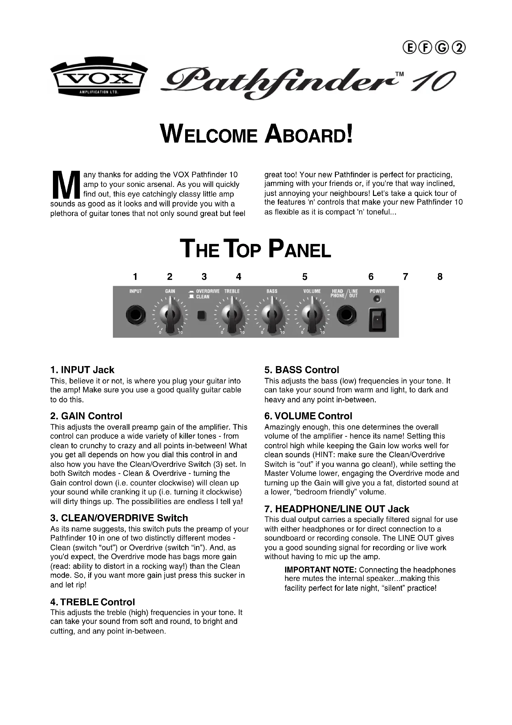 Download the instructions for your Guitar amp in PDF format for free! Find your manual Pathfinder Bass 10 - VOX and take your electronic device back in hand. On this page are published all the documents necessary for the use of your device. Pathfinder Bass 10 by VOX.