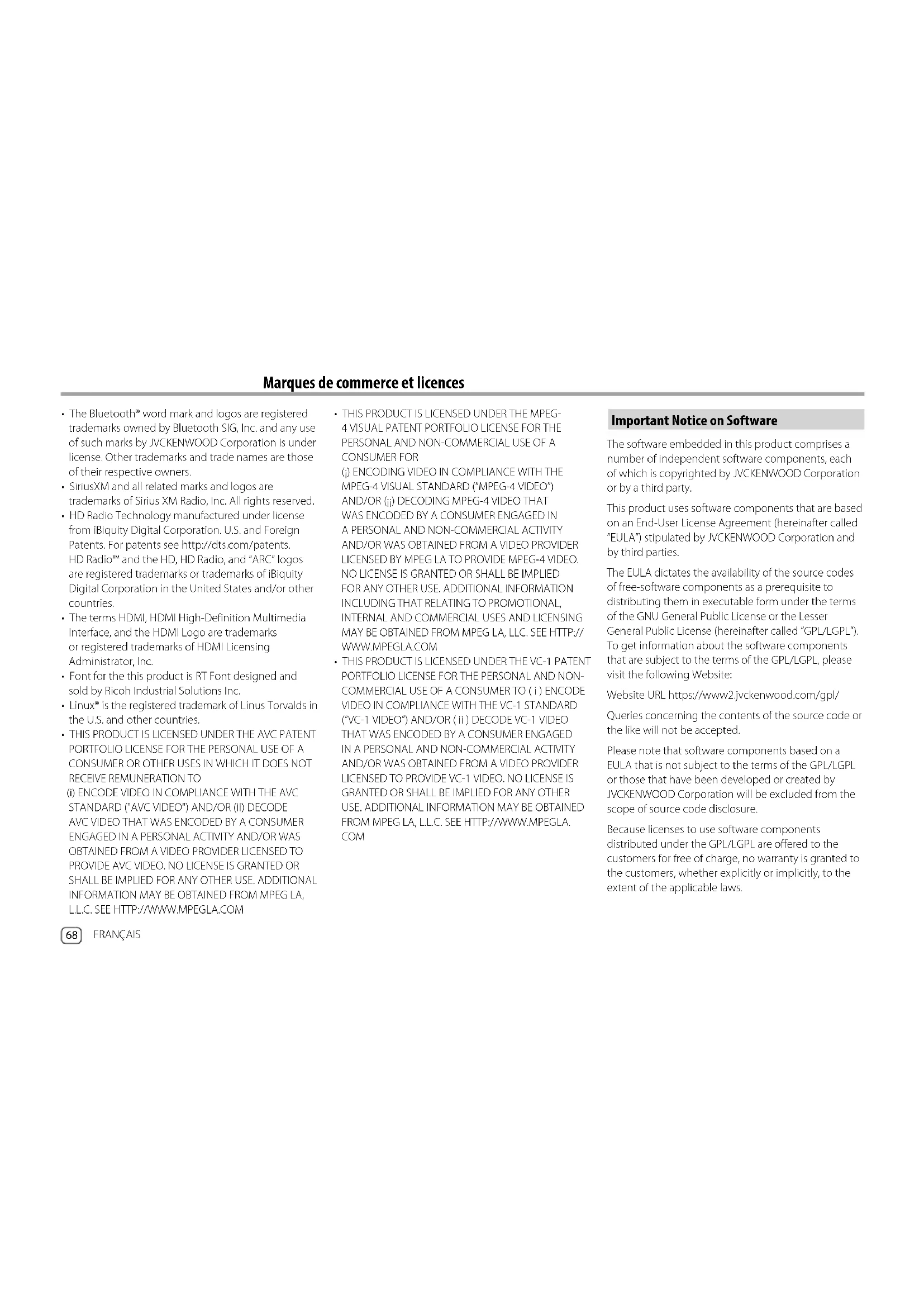 FRANÇAIS 01_DMX_709S_KN_FR.indb 6801_DMX_709S_KN_FR.indb 68 9/8/2022 4:23:37 PM9/8/2022 4:23:37 PMUnless otherwise stipulated by the applicable laws or agreed upon in writing, the copyright holders or those who are entitled to modify and redistribute the software components are not held responsible for any and all damages resulting from their use or from inability to use them. For more information about the terms of use of the software components, required items of compliance and so on, please refer to the GPL/LGPL. Customers wishing themselves to use a software component that is subject to the GPL/LGPL embedded in this product are encouraged to read the terms of the corresponding license before use. Because each individual license is prescribed by a third party other than JVCKENWOOD Corporation, the original (English) of the license is presented. EULA Software License Agreement JVCKENWOOD Corporation (hereinafter called “Licensor”) holds either the copyright to the embedded software or the right to sublicense it. This agreement establishes the conditions under which the customer uses this “Licensed Software.” The customer shall agree to the terms of this license agreement before proceeding to use Licensed Software. This agreement is deemed to have taken effect when the customer (hereinafter called “User”) has used a product implementation of Licensed Software. The Licensed Software may contain software Licensor has been licensed to use by third parties directly or indirectly. Some third parties may have terms of use prescribed for their customers, apart from this Software License Agreement. This agreement does not apply to such software. Be sure to consult “Important Notice on Software” as presented separately. Article 1 (General) Licensor grants to User a non-exclusive, non-assignable right of use Licensed Software within the country where the User purchases the Product (hereinafter the "Country") (except for the exception provided for in Paragraph 1, Article 3). Article 2 (Right of Use)