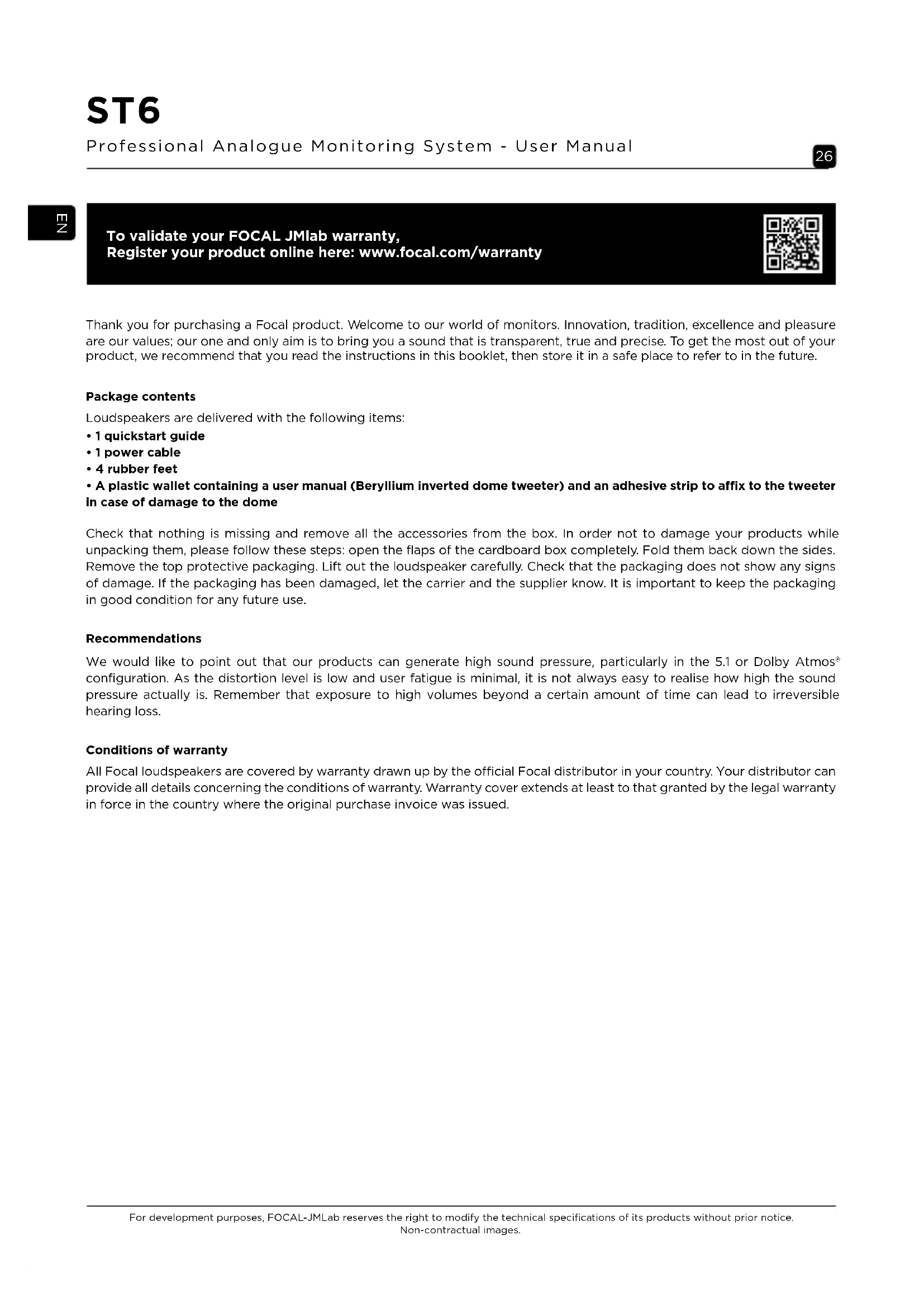 - A plastic wallet containing a user manual (Beryllium inverted dome tweeter) and an adhesive strip to affix to the tweeter in case of damage to the dome Check that nothing is missing and remove all the accessories from the box. In order not to damage your products while unpacking them, please follow these steps: open the flaps of the cardboard box completely. Fold them back down the sides. Remove the top protective packaging. Lift out the loudspeaker carefully. Check that the packaging does not show any signs of damage. If the packaging has been damaged, let the carrier and the supplier know. It is important to keep the packaging in good condition for any future use. Recommendations We would like to point out that our products can generate high sound pressure, particularly in the 5.1 or Dolby Atmos® configuration. As the distortion level is low and user fatigue is minimal, it is not always easy to realise how high the sound pressure actually is. Remember that exposure to high volumes beyond a certain amount of time can lead to irreversible hearing loss. Conditions of warranty All Focal loudspeakers are covered by warranty drawn up by the ocial Focal distributor in your country. Your distributor can provide all details concerning the conditions of warranty. Warranty cover extends at least to that granted by the legal warranty in force in the country where the original purchase invoice was issued.27 ST6 Professional Analogue Monitoring System - User Manual