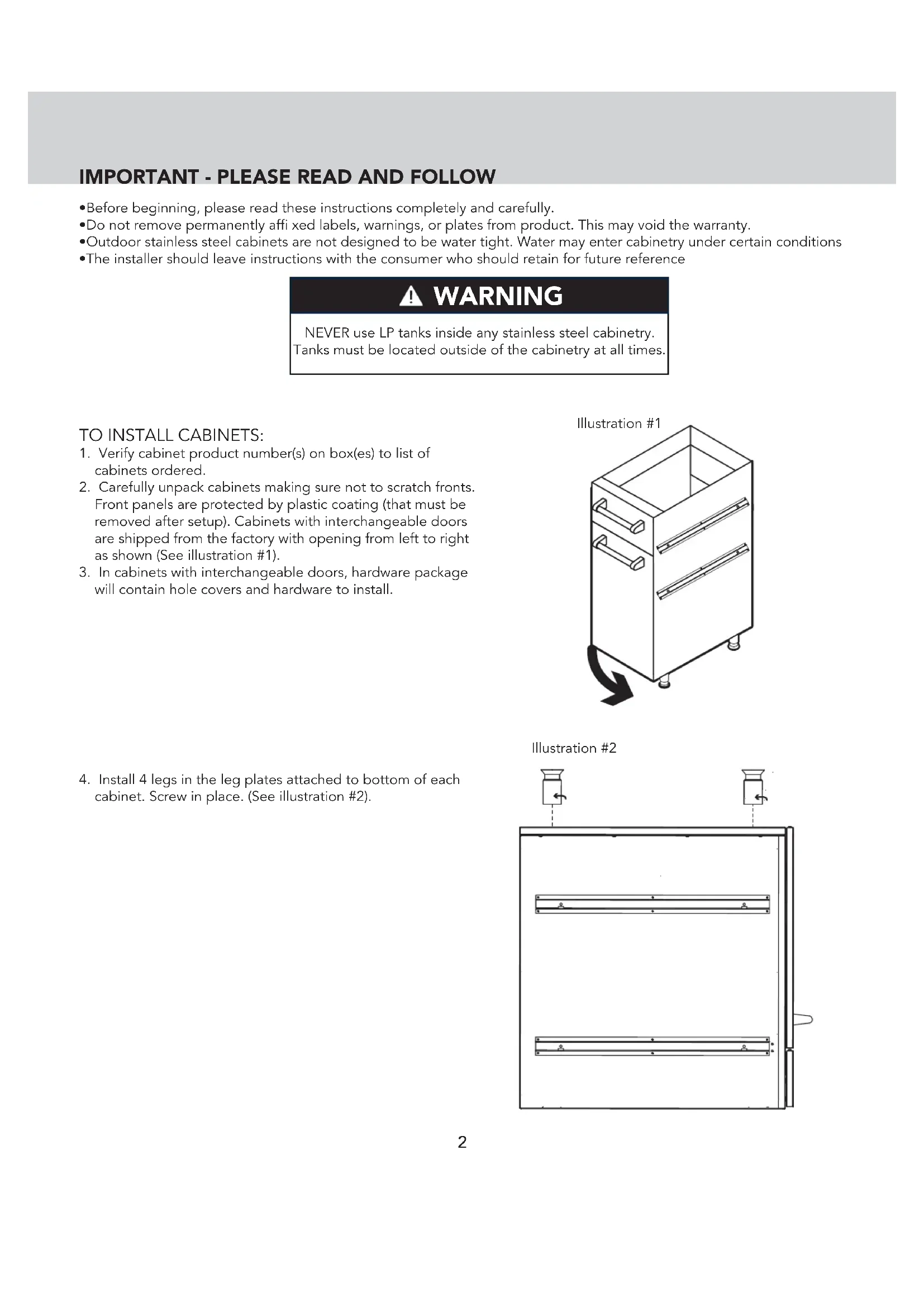 cabinet. Screw in place. (See illustration #2). Illustration #2 WARNING NEVER use LP tanks inside any stainless steel cabinetry. Tanks must be located outside of the cabinetry at all times.3 IMPORTANT - PLEASE READ AND FOLLOW!
