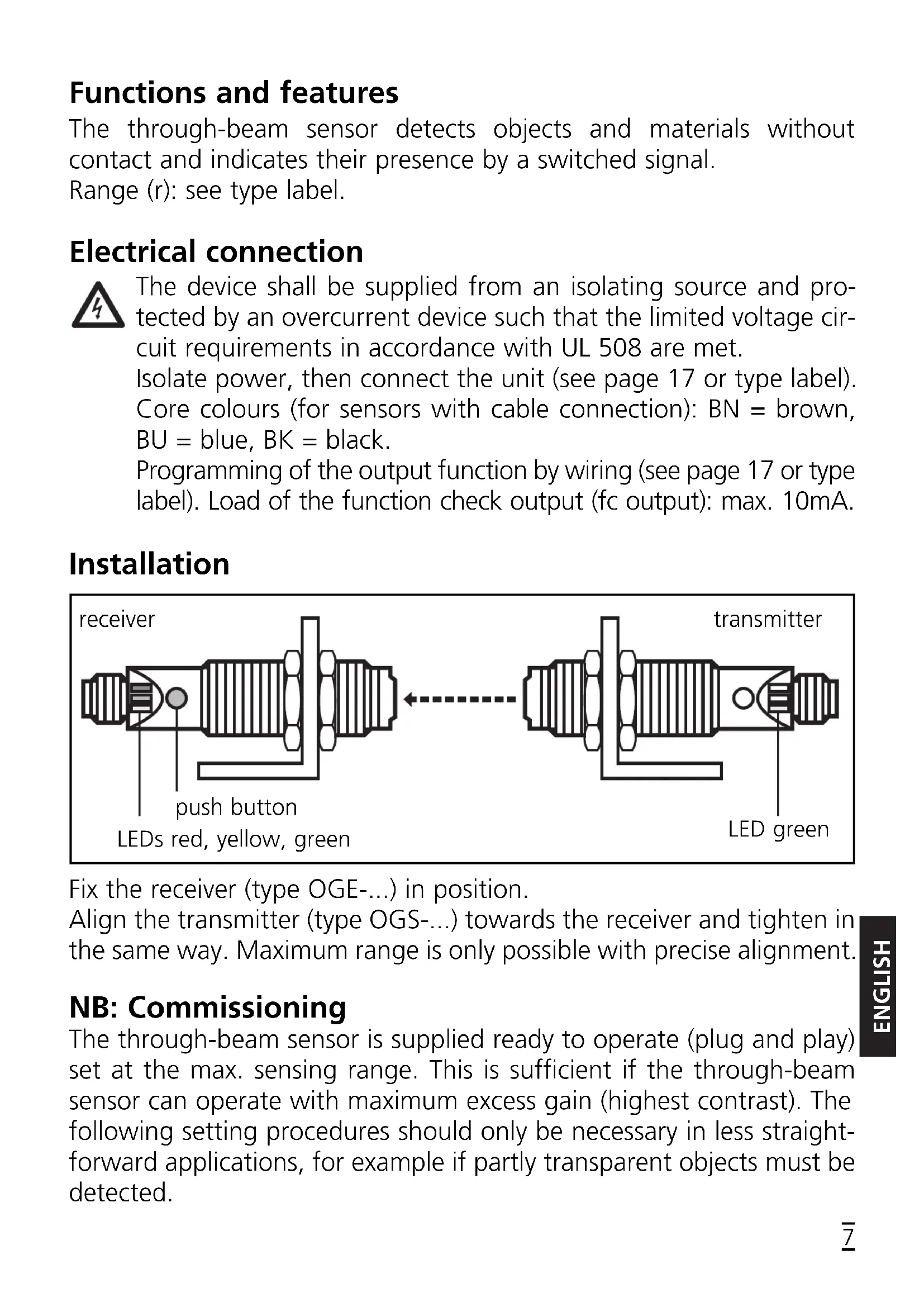LED green is lit unit is ready for operation LED yellow is lit output is switched LEDs yellow + red flashing alternately, 2 Hz: output short-circuited flashing alternately, 1 Hz: internal malfunction (output is not switched) LED red is lit error in object detection, e.g. maladjustment, soiling of the lenses Press for 10s. The red LED lights for a short time, then the yellow and green LEDs flash alternately; after 10s the LEDs go out, the unit is locked. Press for 10s. After 10s the LEDs go out, locking is annulled.ENGLISH Function check output (not for sensors with cable connection)