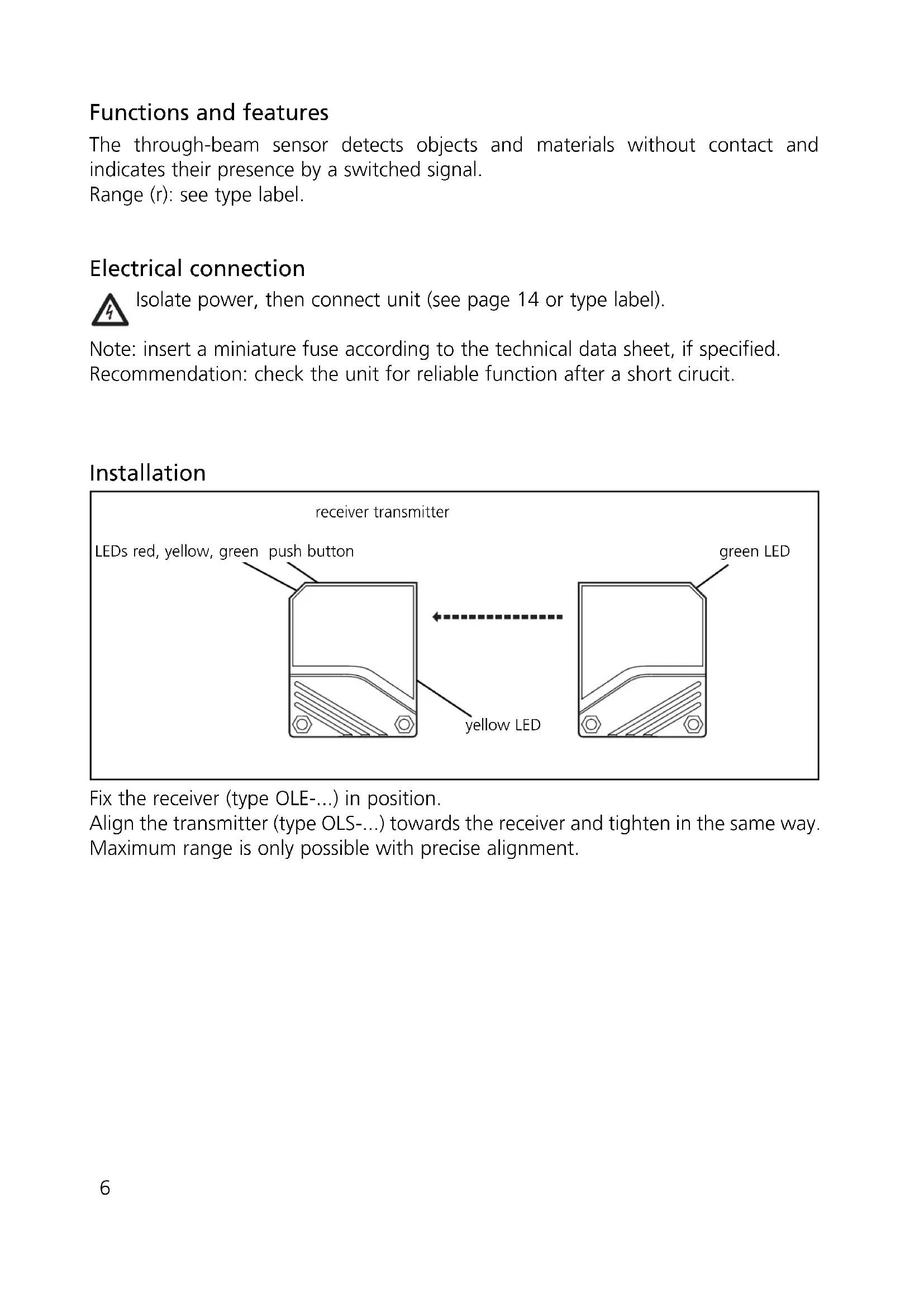 - Moving objects in the detection area The unit detects input signals of various intensity in any sequence and calculates the optimum switching threshold. If the setting of the switching threshold is not possible (e.g. object signal and background signal are about the same), the red LED flashes after step 3. The unit then passes into the operating mode with the switching signal being un- changed. If the programming button is not activated for 15 minutes during the pro- gramming process, the unit passes automatically into the operating mode with the switching threshold being unchanged. Setting of the maximum sensitivity: