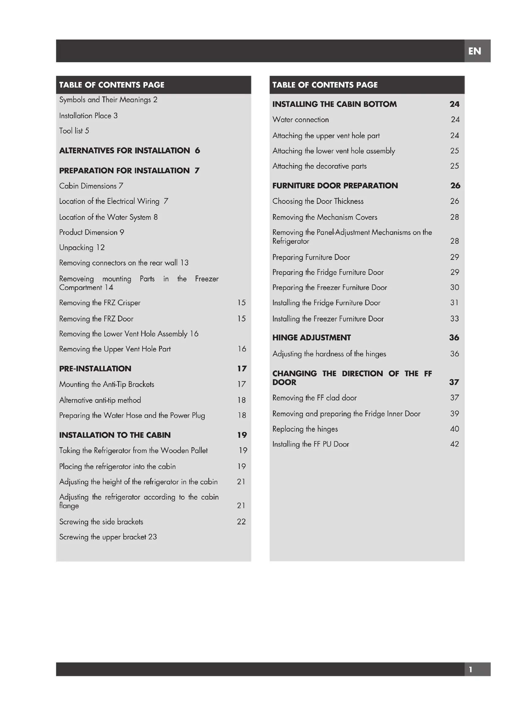Taking the Refrigerator from the Wooden Pallet 19 Placing the refrigerator into the cabin 19 Adjusting the height of the refrigerator in the cabin 21 Adjusting the refrigerator according to the cabin flange 21 Screwing the side brackets 22 Screwing the upper bracket 23
