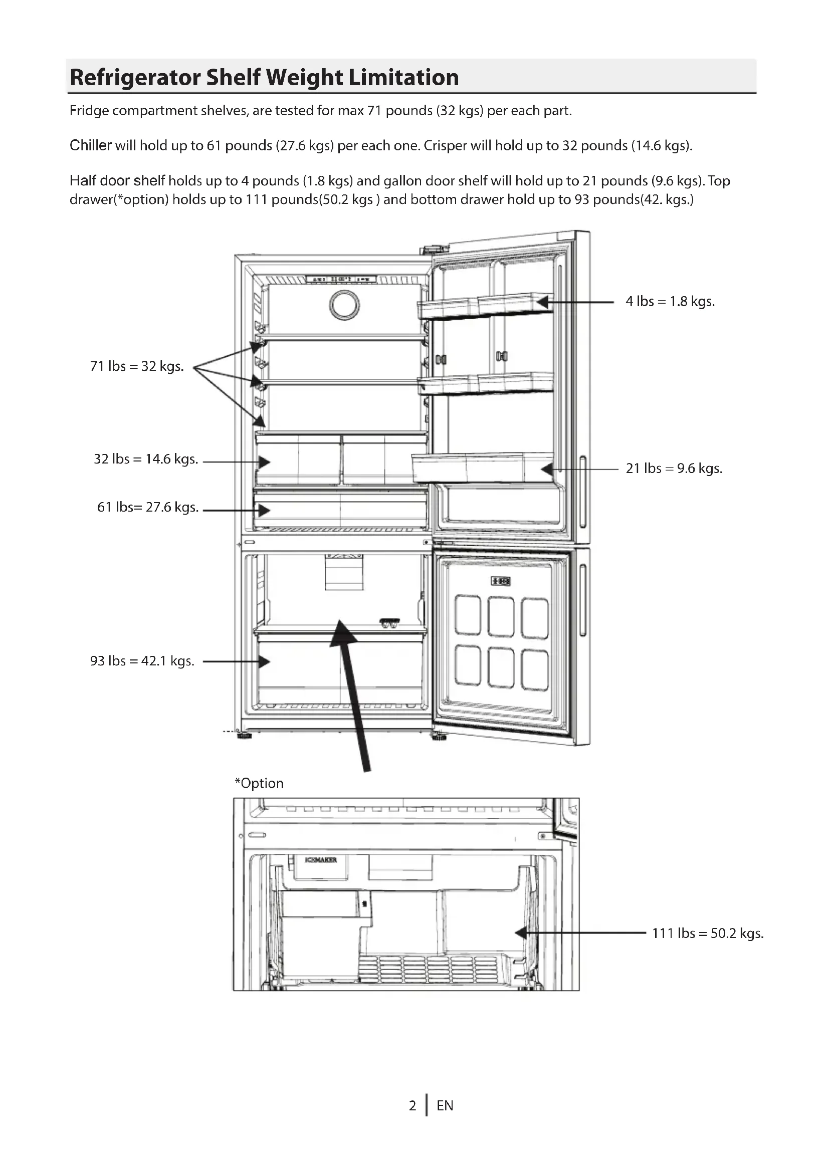 Refrigerator Shelf Weight Limitation Fridge compartment shelves, are tested for max 71 pounds (32 kgs) per each part. Chiller will hold up to 61 pounds (27.6 kgs) per each one. Crisper will hold up to 32 pounds (14.6 kgs). Half door shelf holds up to 4 pounds (1.8 kgs) and gallon door shelf will hold up to 21 pounds (9.6 kgs). Top drawer(*option) holds up to 111 pounds(50.2 kgs ) and bottom drawer hold up to 93 pounds(42. kgs.) 32 lbs = 14.6 kgs. 71 lbs = 32 kgs. 61 lbs= 27.6 kgs. 111 lbs = 50.2 kgs. 93 lbs = 42.1 kgs. 21 lbs = 9.6 kgs. 4 lbs = 1.8 kgs. *OptionThis section contains safety instructions that will help protect from risk of personal injury or property damage. Failure to follow these instructions shall void any warranty.
