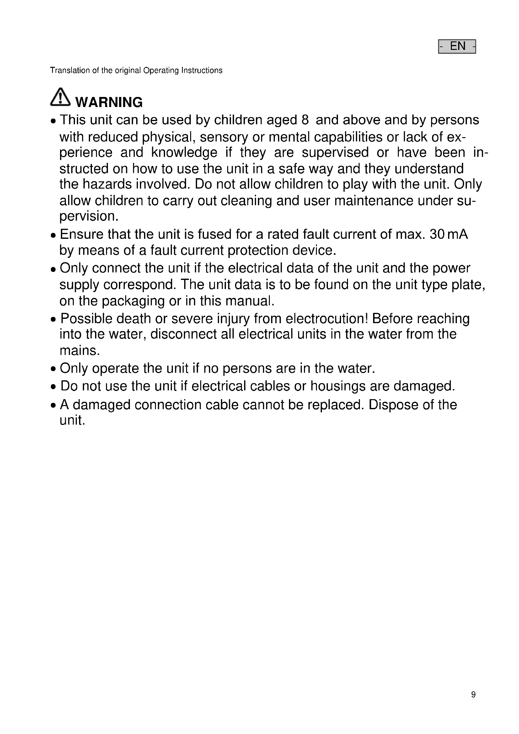 Only operate the unit if no persons are in the water. Do not use the unit if electrical cables or housings are damaged.