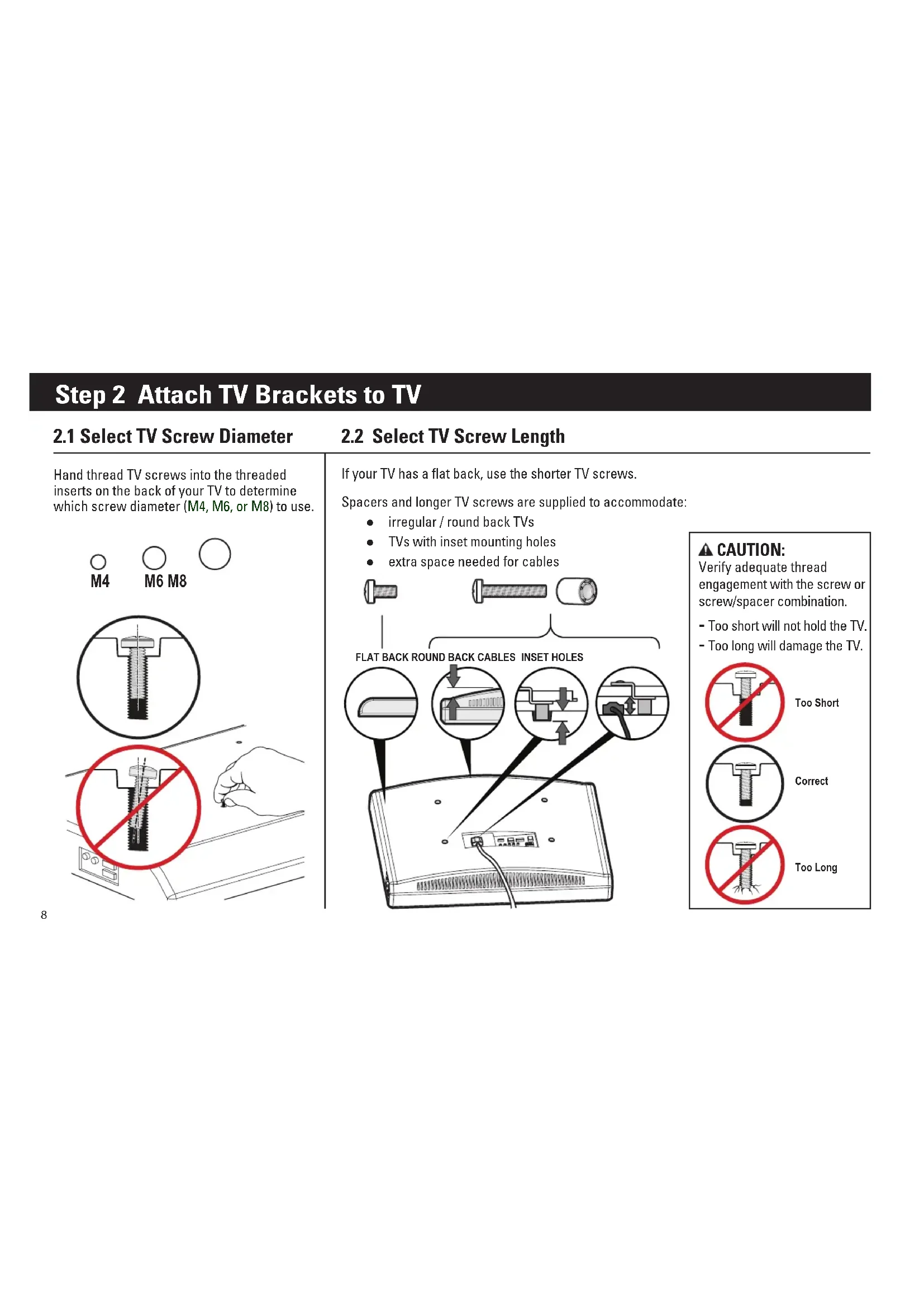 If your TV has a flat back, use the shorter TV screws. Spacers and longer TV screws are supplied to accommodate: ● irregular / round back TVs ● TVs with inset mounting holes ● extra space needed for cables Hand thread TV screws into the threaded inserts on the back of your TV to determine which screw diameter (M4, M6, or M8) to use. CAUTION: Verify adequate thread engagement with the screw or screw/spacer combination. - Too short will not hold the TV. - Too long will damage the TV. Step 2 Attach TV Brackets to TV9