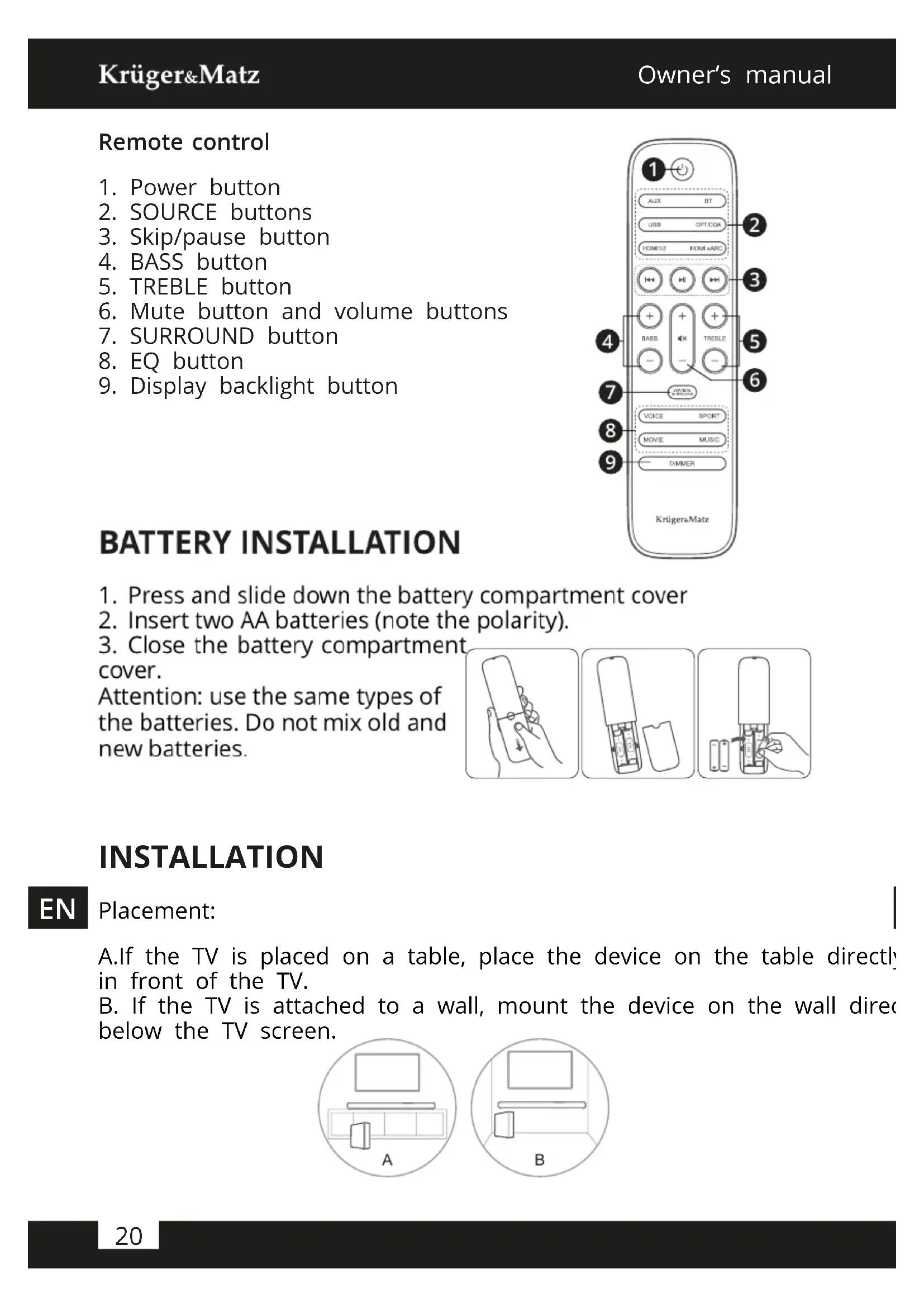 MORE For more information on this device visit: www.krugermatz.com. Read owner's manual carefully before using your device. Visit www.krugermatz.com website for more products and accessories. In case of any doubts or questions reach out to our Frequently Asked Questions section. REMOTE CONTROL