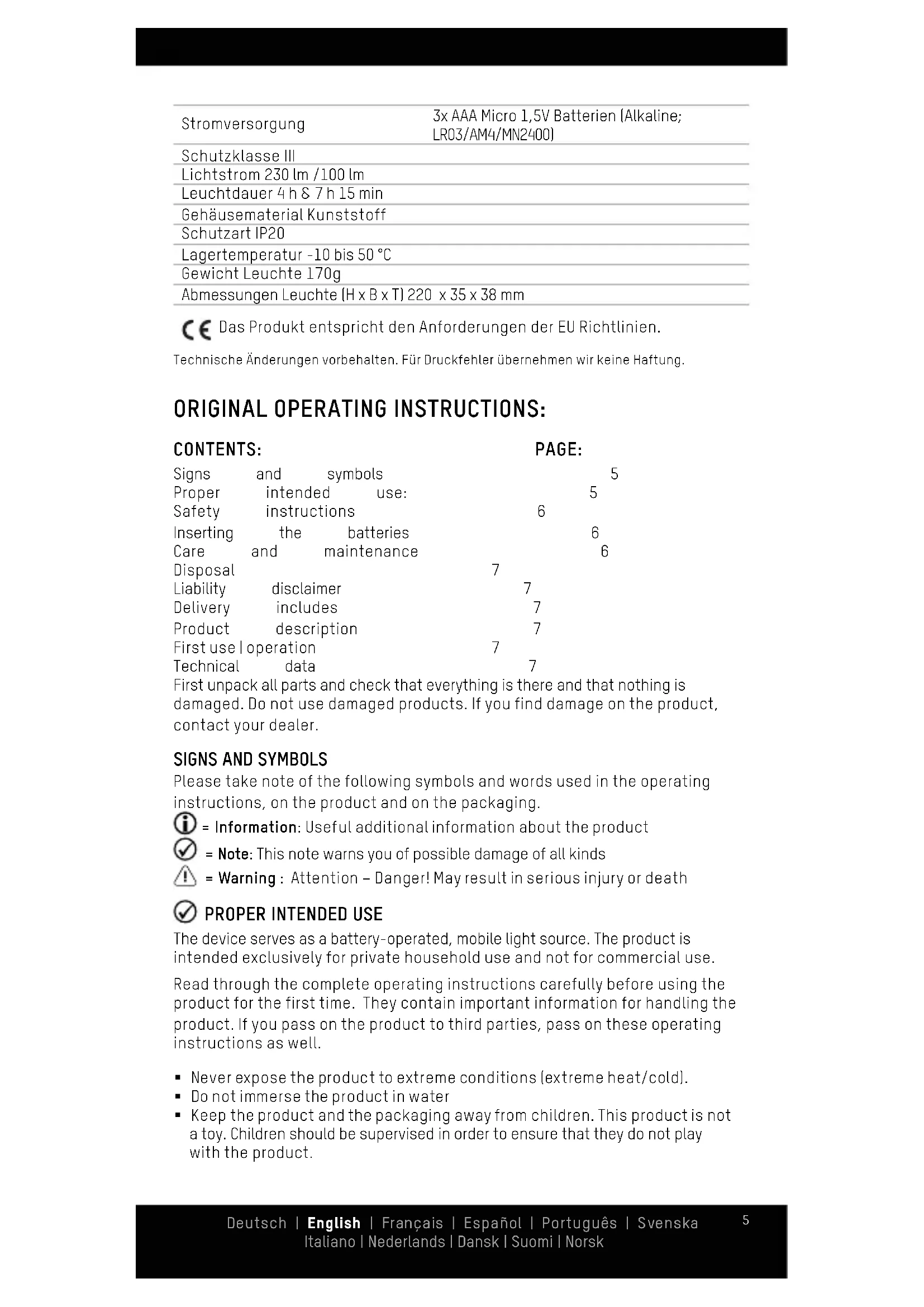 The device serves as a battery-operated, mobile light source. The product is intended exclusively for private household use and not for commercial use. Read through the complete operating instructions carefully before using the product for the first time. They contain important information for handling the product. If you pass on the product to third parties, pass on these operating instructions as well. § Never expose the product to extreme conditions (extreme heat/cold). § Do not immerse the product in water § Keep the product and the packaging away from children. This product is not a toy. Children should be supervised in order to ensure that they do not play with the product. Deutsch | English | Français | Español | Português | Svenska Italiano | Nederlands | Dansk | Suomi | Norsk6 § This product is not to be used by persons (including children) who have res- tricted physical, sensory or mental capabilities or who do not have adequate experience and knowledge in handling this product. Such persons must be instructed beforehand by a supervisory person who is responsible for their safety or must be supervised during the use of the product! § Do not modify the product! Repair work shall only be carried out by the manufacturer or by a service technician appointed by the manufacturer or by a similarly qualified person. § The lamp may be used indoors exclusively. § Always keep the product dry.