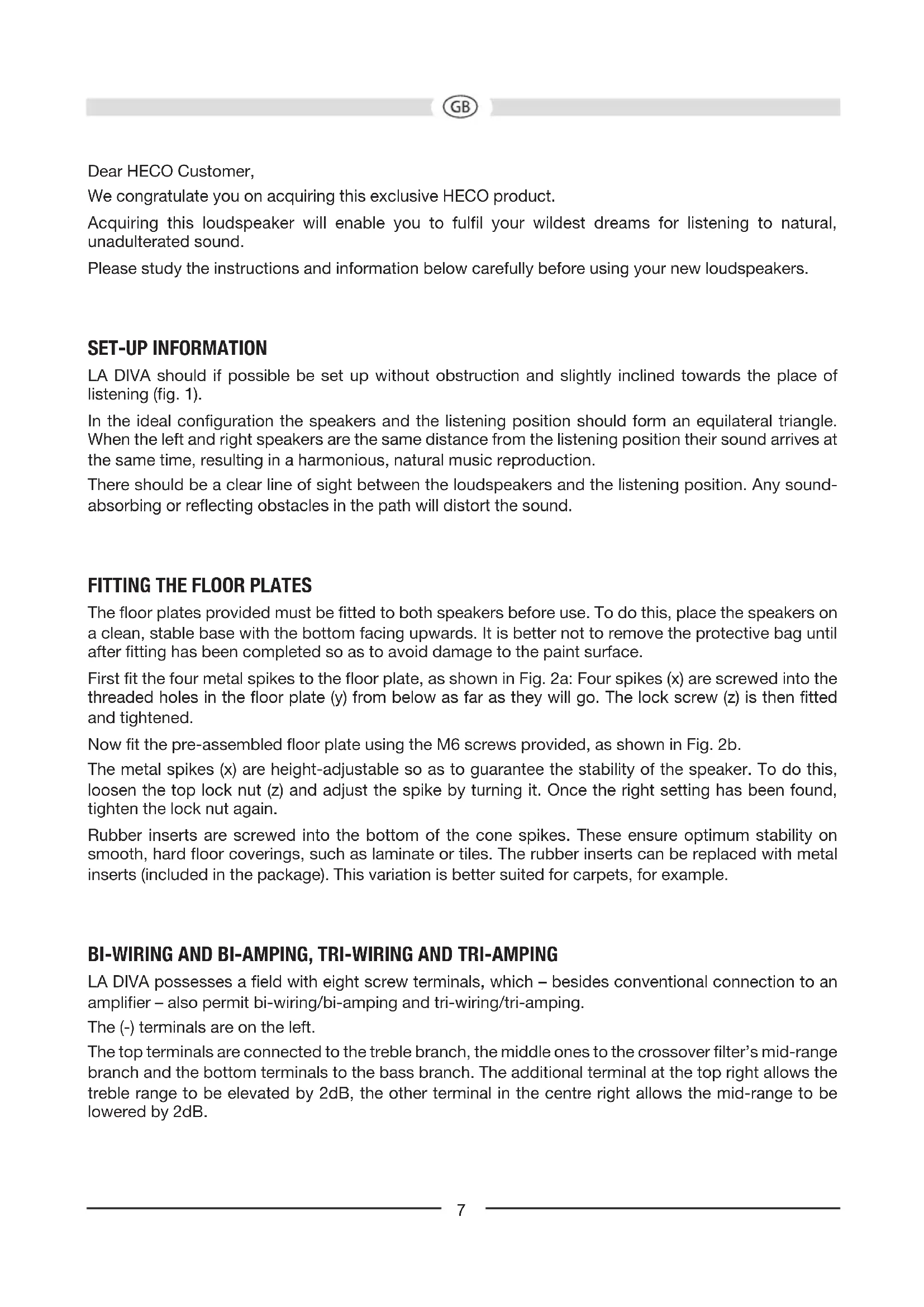 - Non-ready-made (fig. 4c) Strip 10 – 15 mm of insulation from the ends of non-ready-made cables. Twist the ends – this is much better than tinning them with solder – insert them in the terminals and tighten the terminal screws firmly. Before switching on the system double-check all your connections and make sure that the terminal screws are tight and that there are no short circuits caused by stray wire filaments – this could cause serious damage to your amplifier!9 MAINTENANCE The lacquered surface is best cleaned with a mild household cleaner. On no account use furniture polish or similar products on these surfaces. HOW TO AVOID DAMAGE TO YOUR VALUABLE SPEAKERS All HECO loudspeakers are designed and built for optimum sound reproduction with the tone controls in the central position – i.e. with “linear” amplifier output. Turning up the bass and treble controls too far delivers more power to the woofers and/or tweeters, and at high volumes this can actually destroy the speaker units! If the output of your amplifier is significantly higher than the rated power handling capacity of your speakers extremely high volumes can physically destroy your speakers. This doesn’t actually happen often but you should be aware that it is possible. Weak amplifiers with low output ratings can actually be more dangerous for your speakers at medium volumes because weak amplifiers may overload much faster than powerful ones and this causes measurable and audible distortion, which is extremely dangerous to your loudspeakers. Always turn the volume down immediately as soon as you hear distortion! If you like listening to loud music make sure that your amplifier can deliver at least as much power as the speakers’ power-handling rating. THE SOUND YOU CAN’T HEAR... Amplifiers, tuners and CD players can all produce inaudible high-frequency signals – and this doesn’t only apply to cheap products. If your tweeters fail at low or medium volumes you should have a qualified technician check your system components for dangerous inaudible signals. SPECIFICATIONS Configuration: 3-way bass reflex Power-handling capacity: 300 / 550 W Impedance: 4 – 8 ohms Frequency response: 17 – 52 500 Hz Recommended amplifier output: 30 – 550 W Efficiency (1W/1m): 93 dB Dimensions (WxHxD): 385 x 1340 x 435 (465 incl. terminal and floor plate) mm Weight: 49.8 kg Accessory: Metal spikes Rubber Spikes Subject to technical change.10 Très cher client, Nous vous félicitons pour l’acquisition de ce produit exclusif de HECO. Grâce à l’acquisition de ce haut-parleur, vous pourrez satisfaire de manière souveraine vos exigences élevées pour un son naturel et sans défaut. Pour obtenir les meilleurs résultats et éviter les accidents, lisez attentivement les instructions et respectez les consignes ci-jointes avant la mise en service de vos nouvelles enceintes.