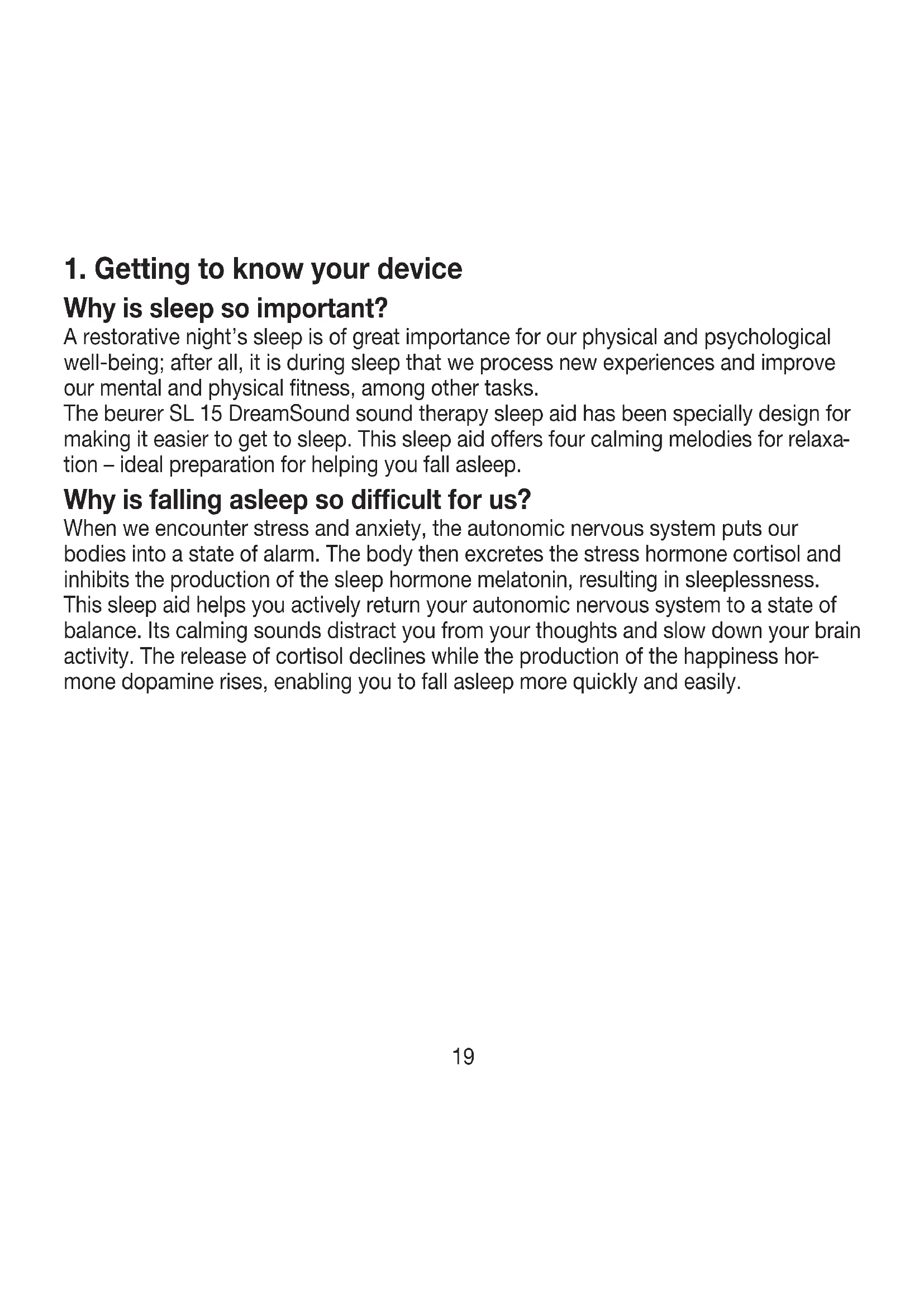 tion – ideal preparation for helping you fall asleep. Why is falling asleep so difficult for us? When we encounter stress and anxiety, the autonomic nervous system puts our bodies into a state of alarm. The body then excretes the stress hormone cortisol and inhibits the production of the sleep hormone melatonin, resulting in sleeplessness. This sleep aid helps you actively return your autonomic nervous system to a state of balance. Its calming sounds distract you from your thoughts and slow down your brain activity. The release of cortisol declines while the production of the happiness hor