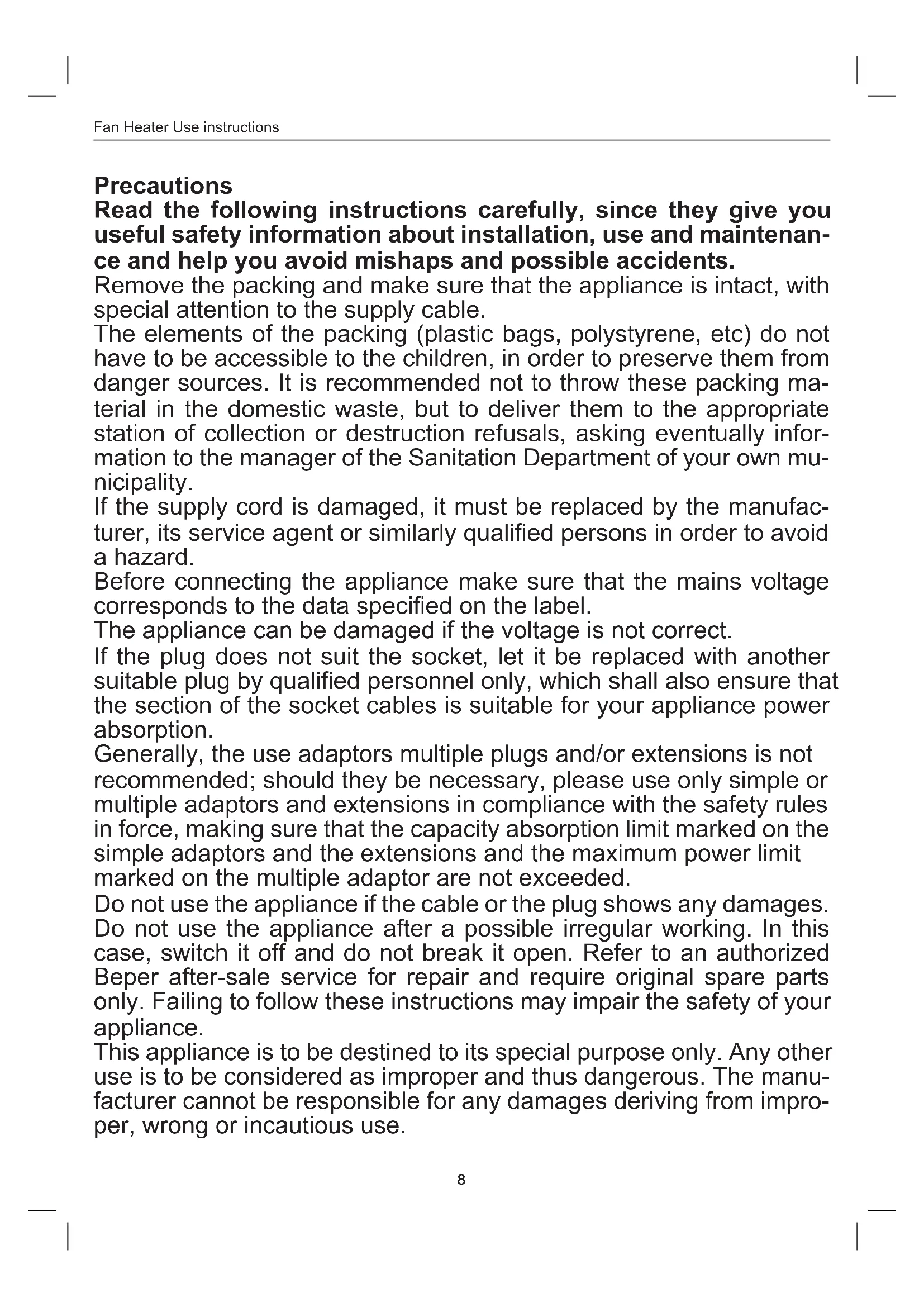 Precautions Read the following instructions carefully, since they give you useful safety information about installation, use and maintenan- ce and help you avoid mishaps and possible accidents. Remove the packing and make sure that the appliance is intact, with special attention to the supply cable. The elements of the packing (plastic bags, polystyrene, etc) do not have to be accessible to the children, in order to preserve them from danger sources. It is recommended not to throw these packing ma- terial in the domestic waste, but to deliver them to the appropriate station of collection or destruction refusals, asking eventually infor- mation to the manager of the Sanitation Department of your own mu- nicipality. If the supply cord is damaged, it must be replaced by the manufac- turer, its service agent or similarly qualied persons in order to avoid a hazard. Before connecting the appliance make sure that the mains voltage corresponds to the data specied on the label. The appliance can be damaged if the voltage is not correct. If the plug does not suit the socket, let it be replaced with another suitable plug by qualied personnel only, which shall also ensure that the section of the socket cables is suitable for your appliance power absorption. Generally, the use adaptors multiple plugs and/or extensions is not recommended; should they be necessary, please use only simple or multiple adaptors and extensions in compliance with the safety rules in force, making sure that the capacity absorption limit marked on the simple adaptors and the extensions and the maximum power limit marked on the multiple adaptor are not exceeded. Do not use the appliance if the cable or the plug shows any damages. Do not use the appliance after a possible irregular working. In this case, switch it off and do not break it open. Refer to an authorized Beper after-sale service for repair and require original spare parts only. Failing to follow these instructions may impair the safety of your appliance. This appliance is to be destined to its special purpose only. Any other use is to be considered as improper and thus dangerous. The manu- facturer cannot be responsible for any damages deriving from impro- per, wrong or incautious use.Fan Heater Use instructions