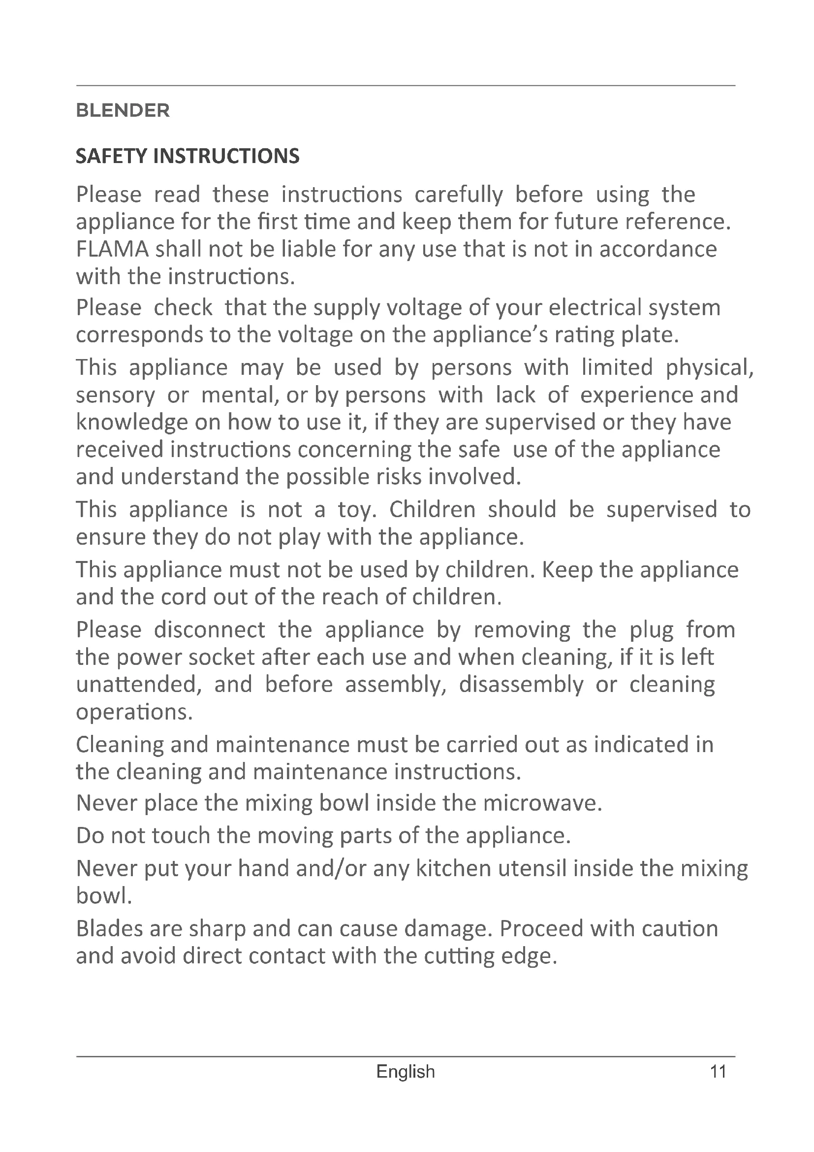 AMBIENTE Este símbolo indica la recogida separada de equipos eléctricos y electrónicos. El objevo prioritario de la recogida de estos residuos es reducir la candad a eliminar, promover la reulización, el reciclado y otras formas de valorización, para reducir sus efectos negavos sobre el medio ambiente. Cuando este aparato esté fuera de uso, no debe desecharse con los demás residuos urbanos no diferenciados. El usuario es responsable de proceder a su entrega gratuita en las instalaciones de recogida selecva existentes para ello. La recuperación de los equipamientos fuera de uso también podrá ser realizada por los puntos de venta, en la compra de un equipamiento nuevo que sea equivalente y que desempeñe las mismas funciones. Para obtener información más detallada sobre los locales de recogida debe dirigirse a su Ayuntamiento o a un punto de venta de estos equipamientos.11 English BLENDER SAFETY INSTRUCTIONS Please read these instrucons carefully before using the appliance for the rst me and keep them for future reference. FLAMA shall not be liable for any use that is not in accordance with the instrucons. Please check that the supply voltage of your electrical system corresponds to the voltage on the appliance’s rang plate. This appliance may be used by persons with limited physical, sensory or mental, or by persons with lack of experience and knowledge on how to use it, if they are supervised or they have received instrucons concerning the safe use of the appliance and understand the possible risks involved. This appliance is not a toy. Children should be supervised to ensure they do not play with the appliance. This appliance must not be used by children. Keep the appliance and the cord out of the reach of children. Please disconnect the appliance by removing the plug from the power socket aer each use and when cleaning, if it is le unaended, and before assembly, disassembly or cleaning operaons. Cleaning and maintenance must be carried out as indicated in the cleaning and maintenance instrucons. Never place the mixing bowl inside the microwave. Do not touch the moving parts of the appliance. Never put your hand and/or any kitchen utensil inside the mixing bowl. Blades are sharp and can cause damage. Proceed with cauon and avoid direct contact with the cung edge.12 www.ama.pt Pay parcular aenon when handling the blades, during assembly and disassembly operaons, when emptying the mixing bowl, and while cleaning. Always use the appliance with the measuring cup in place. Do not remove the measuring cup or lid before the blades have completely stopped moving. Cauon: do not place hot ingredients in the mixing bowl. Before preparing food, allow the food to cool down for a few minutes. Be very careful when handling hot food as you can burn yourself. The maximum lling capacity of the mixing bole must not be exceeded (use the graduaon marks on the bole as a reference). This appliance was designed to be used for a maximum of 2 minutes. When this limit is exceeded, take a cool-down break before using it again, so as not to overload the motor. Do not use this appliance to mix glunous food or substances, such as jam or marmalade. Do not use the appliance if it is not working properly. If the power cord is damaged, have it replaced at an Authorized Flama Technical Assistance Service in order to avoid a hazard. Any intervenon other than cleaning must be carried out only by authorized FLAMA agents. This product complies with the Low-Voltage and Electromagnec Compability Direcves. This instrucon manual is also available in PDF format at www. ama.pt .13 English DESCRIPTION