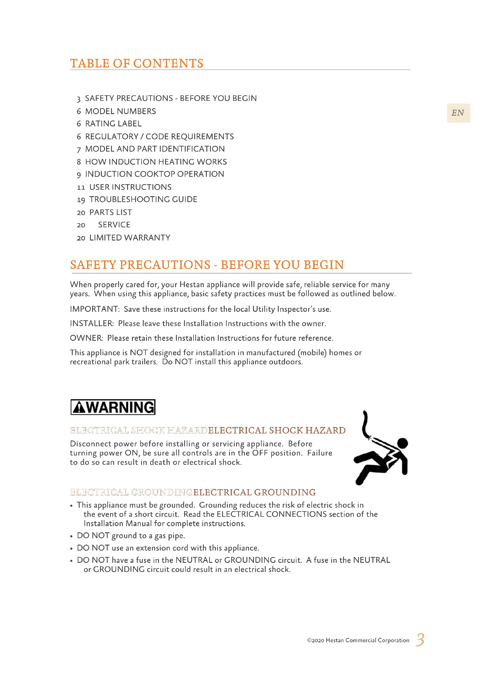 BEFORE INSTALLING OR USING YOUR APPLIANCE TO REDUCE THE RISK OF FIRE, BURN HAZARD, OR OTHER INJURY. KEEP THIS MANUAL FOR FUTURE REFERENCE. Do not store or use gasoline or other flammable vapors and liquids in the vicinity of this or any other appliance. Installation and service must be performed by a qualified installer or service agency. DO NOT REPAIR, REPLACE OR REMOVE ANY PART OF THE APPLIANCE UNLESS SPECIFICALLY RECOMMENDED IN THE MANUAL. IMPROPER INSTALLATION, SERVICE OR MAINTENANCE CAN CAUSE INJURY OR PROPERTY DAMAGE. REFER TO THIS MANUAL FOR GUIDANCE. ALL OTHER SERVICING SHOULD BE DONE BY A QUALIFIED TECHNICIAN. INSTALLER: LEAVE THIS MANUAL WITH THE OWNER OF THE APPLIANCE. HOMEOWNER: RETAIN THIS MANUAL FOR FUTURE REFERENCE. IF THE INFORMATION IN THIS MANUAL IS NOT FOLLOWED EXACTLY, A FIRE OR EXPLOSION MAY RESULT CAUSING PROPERTY DAMAGE, PERSONAL INJURY, OR DEATH.Message from Hestan:Message from Hestan: Hestan’s award-winning culinary innovations and purpose-built features reinvented the restaurant kitchen and redefined culinary experience in some of America’s most acclaimed restaurants. Hestan now takes this performance from the back of the house and puts it front and center in yours. Thoughtfully designed and meticulously built, Hestan will serve you beautifully for years to come. Hestan is the only residential brand born from the dreams and demands of professional chefs. From ranges to refrigeration, every detail is designed to deliver the performance and reliability expected in a restaurant – now available for you. We appreciate you choosing Hestan, and we promise to deliver the very best to you. Welcome to HestanWelcome to Hestan ©2020 Hestan Commercial Corporation