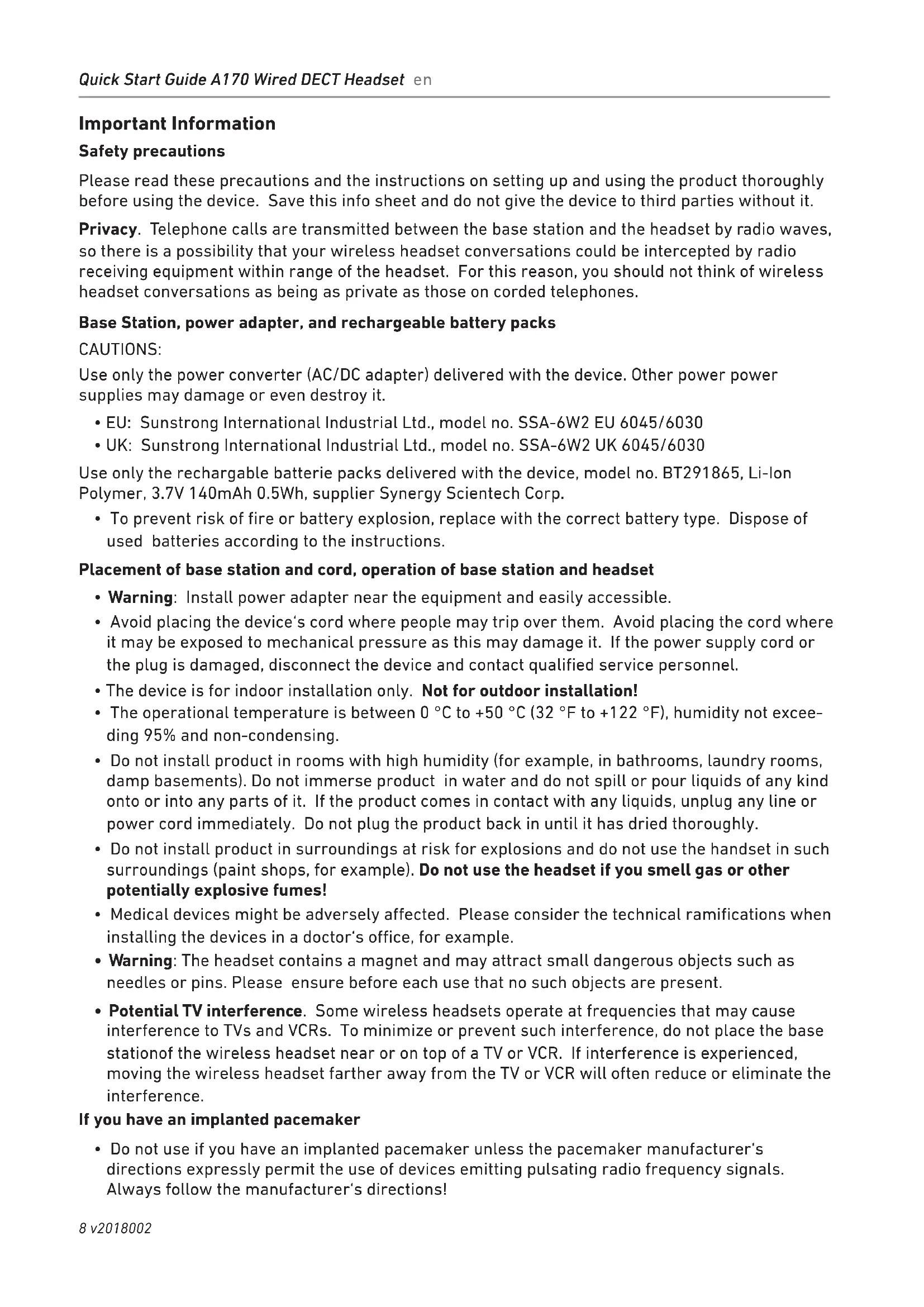 This product uses rechargeable Li-1on battery packs. Only use the battery packs that came with the handset. Do not use any other type of battery since this may lead to leakage, fire, explosion, or other dangerous situations. Never disassemble, alter, or short-circuit batteries or use them for purposes other than the intended one. Charge the batteries only within the headset or the base station, respectively.