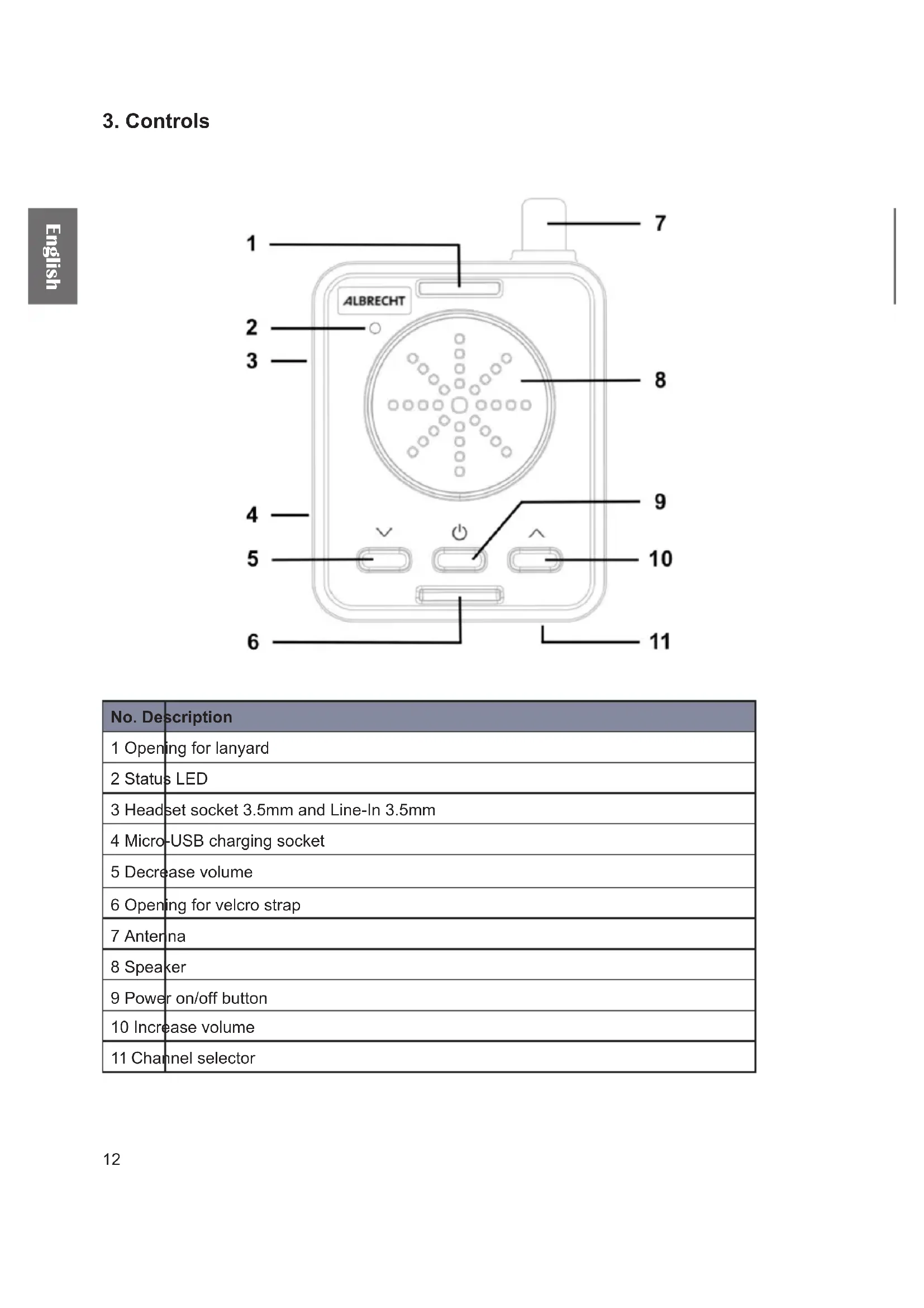 No. Description 1 Opening for lanyard 2 Status LED 3 Headset socket 3.5mm and Line-In 3.5mm 4 Micro-USB charging socket 5 Decrease volume 6 Opening for velcro strap 7 Antenna 8 Speaker 9 Power on/off button 10 Increase volume 11 Channel selector13 English