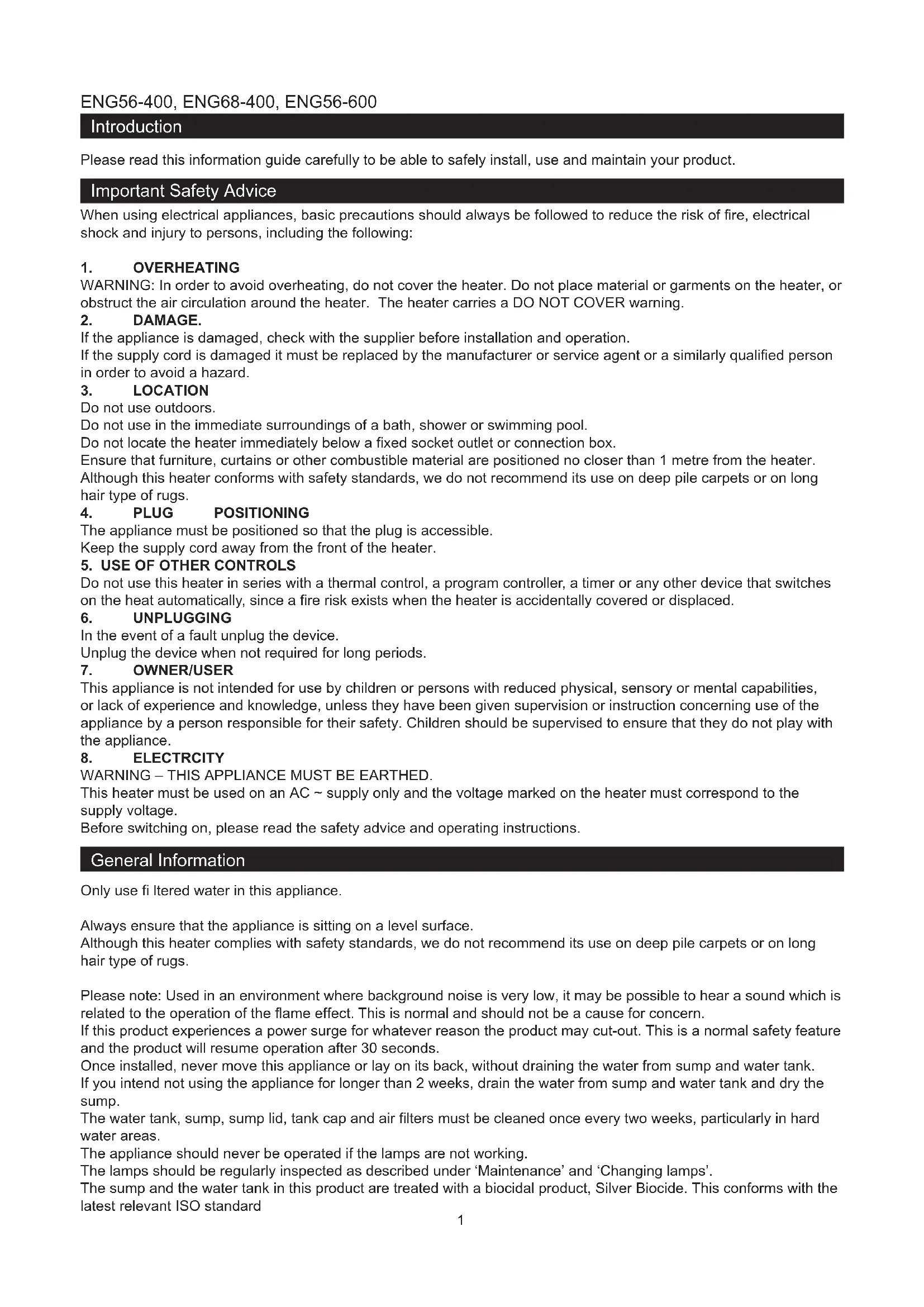 WARNING – THIS APPLIANCE MUST BE EARTHED. This heater must be used on an AC ~ supply only and the voltage marked on the heater must correspond to the supply voltage. Before switching on, please read the safety advice and operating instructions. General Information Only use fi ltered water in this appliance. Always ensure that the appliance is sitting on a level surface. Although this heater complies with safety standards, we do not recommend its use on deep pile carpets or on long hair type of rugs. Please note: Used in an environment where background noise is very low, it may be possible to hear a sound which is related to the operation of the fl ame effect. This is normal and should not be a cause for concern. If this product experiences a power surge for whatever reason the product may cut-out. This is a normal safety feature and the product will resume operation after 30 seconds. Once installed, never move this appliance or lay on its back, without draining the water from sump and water tank. If you intend not using the appliance for longer than 2 weeks, drain the water from sump and water tank and dry the sump. The water tank, sump, sump lid, tank cap and air fi lters must be cleaned once every two weeks, particularly in hard water areas. The appliance should never be operated if the lamps are not working. The lamps should be regularly inspected as described under ‘Maintenance’ and ‘Changing lamps’. The sump and the water tank in this product are treated with a biocidal product, Silver Biocide. This conforms with the latest relevant ISO standard 1Installation Instructions This section describes how to set up your fi re.