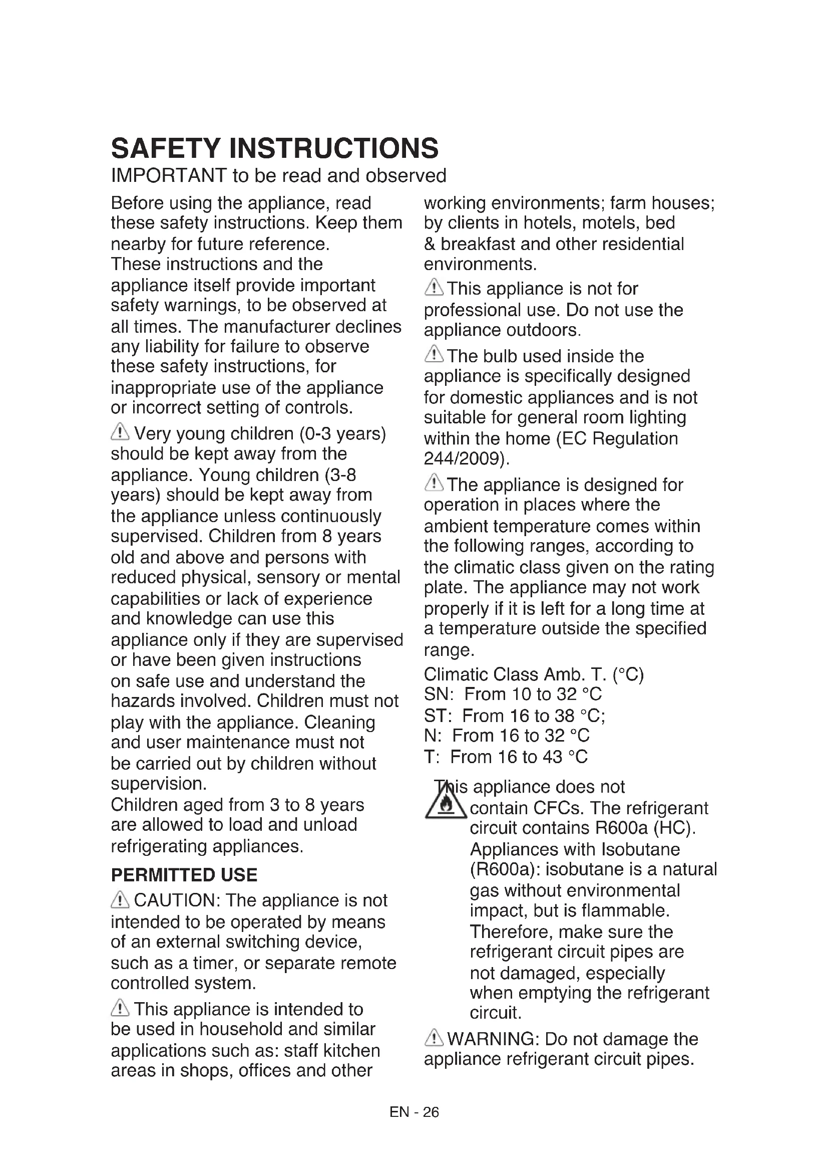 Tato prezentace je pouze informačního rázu a týká se součástí přístroje. Jednotlivé části se mohou lišit dle modelu přístroje.EN - 26 SAFETY INSTRUCTIONS IMPORTANT to be read and observed Before using the appliance, read these safety instructions. Keep them nearby for future reference. These instructions and the appliance itself provide important safety warnings, to be observed at all times. The manufacturer declines any liability for failure to observe these safety instructions, for inappropriate use of the appliance or incorrect setting of controls. Very young children (0-3 years) should be kept away from the appliance. Young children (3-8 years) should be kept away from the appliance unless continuously supervised. Children from 8 years old and above and persons with reduced physical, sensory or mental capabilities or lack of experience and knowledge can use this appliance only if they are supervised or have been given instructions on safe use and understand the hazards involved. Children must not play with the appliance. Cleaning and user maintenance must not be carried out by children without supervision. Children aged from 3 to 8 years are allowed to load and unload refrigerating appliances. PERMITTED USE CAUTION: The appliance is not intended to be operated by means of an external switching device, such as a timer, or separate remote controlled system. This appliance is intended to be used in household and similar applications such as: staff kitchen areas in shops, ofces and other working environments; farm houses; by clients in hotels, motels, bed & breakfast and other residential environments. This appliance is not for professional use. Do not use the appliance outdoors. The bulb used inside the appliance is specically designed for domestic appliances and is not suitable for general room lighting within the home (EC Regulation 244/2009). The appliance is designed for operation in places where the ambient temperature comes within the following ranges, according to the climatic class given on the rating plate. The appliance may not work properly if it is left for a long time at a temperature outside the specied range. Climatic Class Amb. T. (°C) SN: From 10 to 32 °C ST: From 16 to 38 °C; N: From 16 to 32 °C T: From 16 to 43 °C This appliance does not contain CFCs. The refrigerant circuit contains R600a (HC). Appliances with Isobutane (R600a): isobutane is a natural gas without environmental impact, but is ammable. Therefore, make sure the refrigerant circuit pipes are not damaged, especially when emptying the refrigerant circuit.