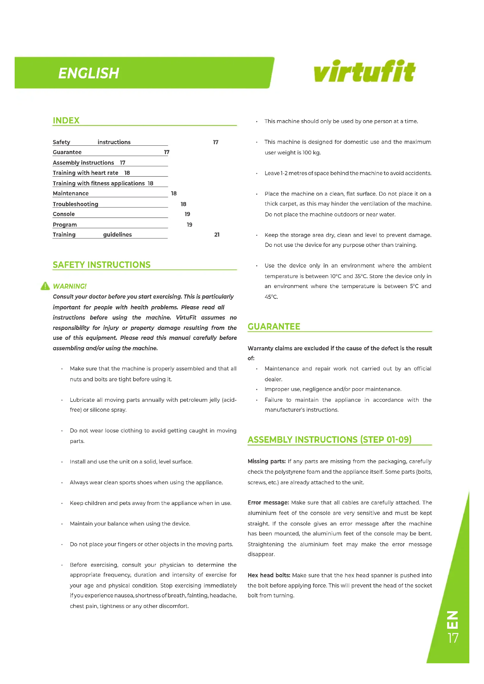 INDEX Safety instructions 17 Guarantee 17 Assembly instructions 17 Training with heart rate 18 Training with fitness applications 18 Maintenance 18 Troubleshooting 18 Console 19 Program 19 Training guidelines 21 SAFETY INSTRUCTIONS WARNING! Consult your doctor before you start exercising. This is particularly important for people with health problems. Please read all instructions before using the machine. VirtuFit assumes no responsibility for injury or property damage resulting from the use of this equipment. Please read this manual carefully before assembling and/or using the machine.