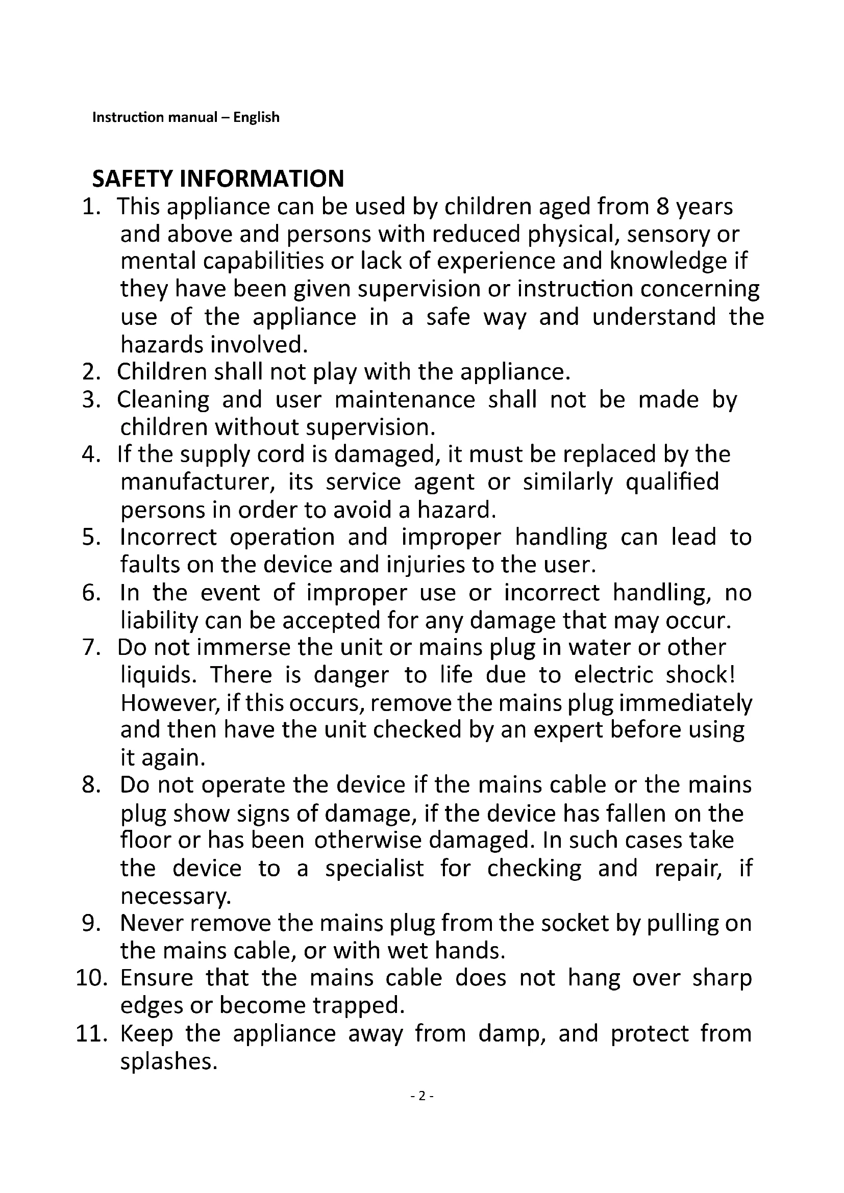 11. Keep the appliance away from damp, and protect from