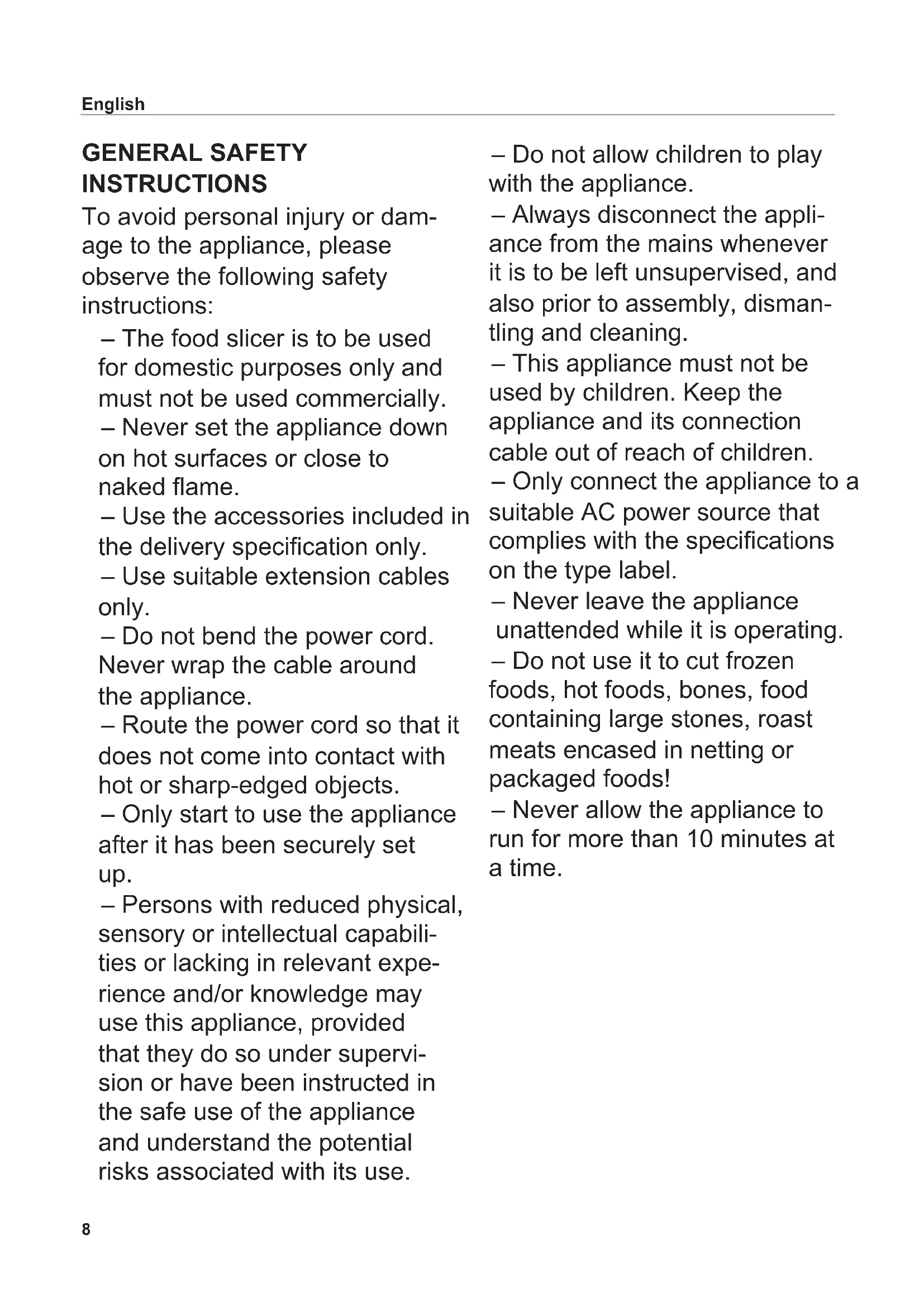 - Protect your hands, by always using the slice carriage and, where applicable, the left-over holder. Exception: Excessively large foods to be sliced.