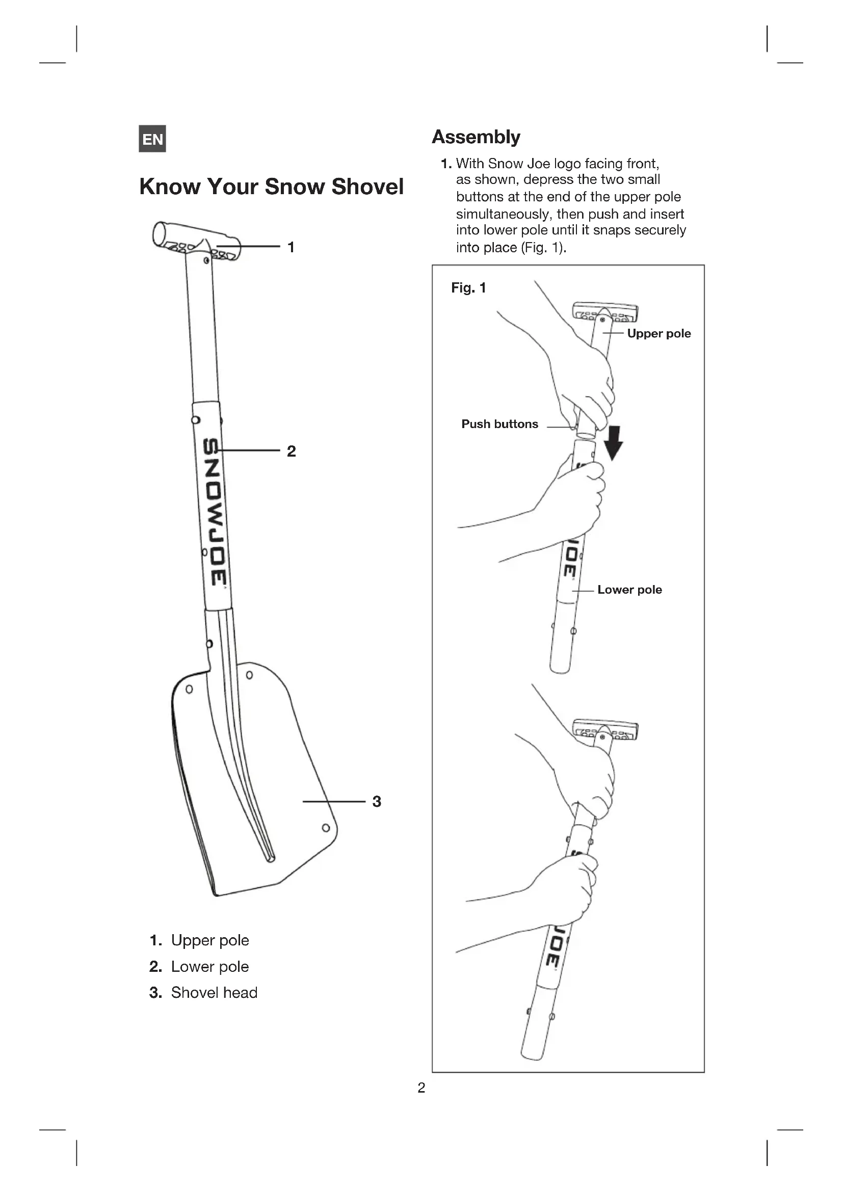 Assembly 1. With Snow Joe logo facing front, as shown, depress the two small buttons at the end of the upper pole simultaneously, then push and insert into lower pole until it snaps securely into place (Fig. 1).