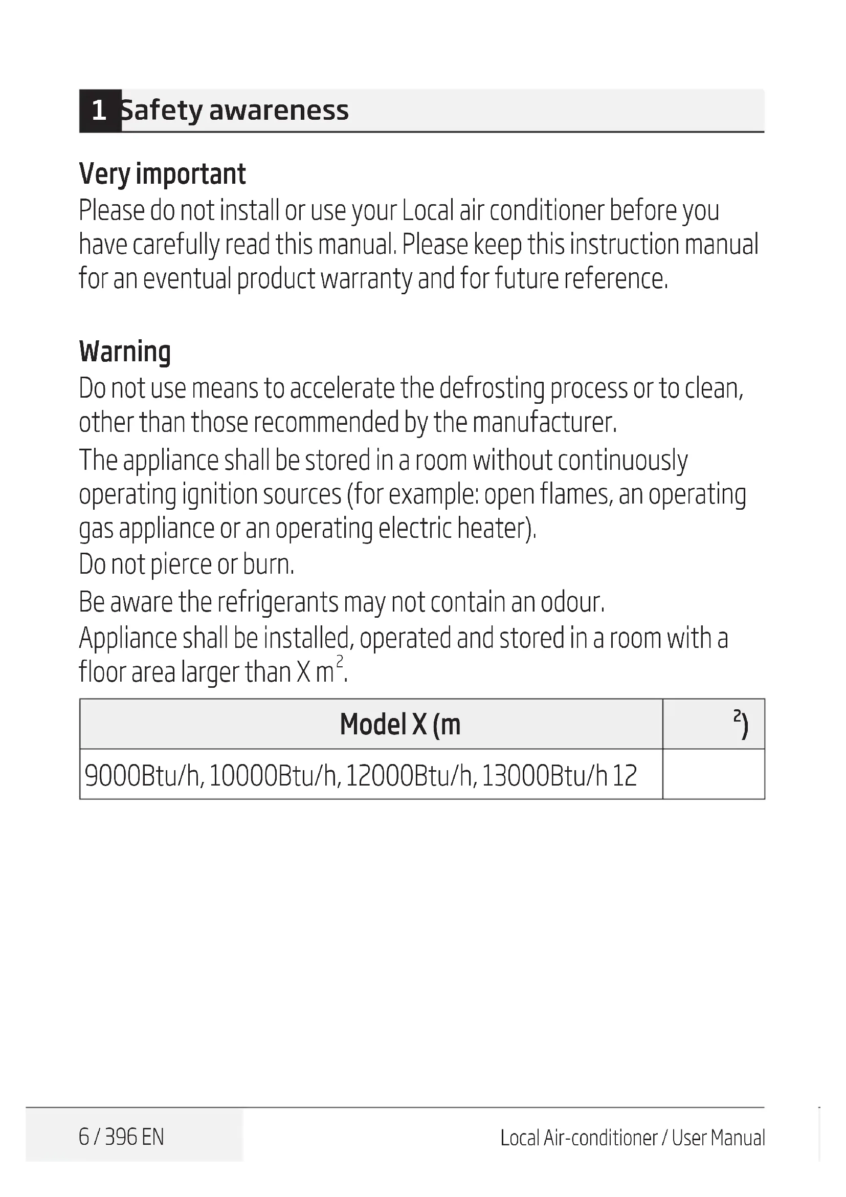 Appliance shall be installed, operated and stored in a room with a floor area larger than × m².