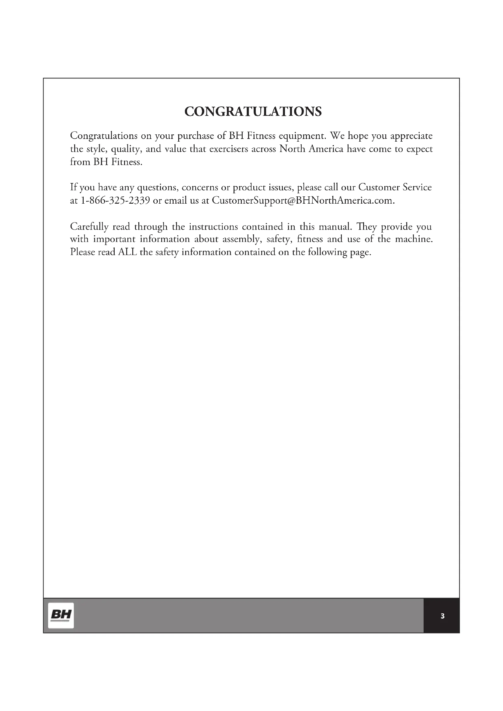 Title Page Introduction 03 Warnings & Labels 04 Safety Information 05 Exercise Instruction 06 Training Guidelines 07 Workout and Stretching 11 Overview 13 Assembly Instructions 14 Instruction Use and Adjustment 17 Maintenance Guide 18 Console Overview 19 Console Operations 20 Exploded View Drawing 21 Parts List 22 Warranty 233 CONGRATULATIONS Congratulations on your purchase of BH Fitness equipment. We hope you appreciate the style, quality, and value that exercisers across North America have come to expect from BH Fitness. If you have any questions, concerns or product issues, please call our Customer Service at 1-866-325-2339 or email us at CustomerSupport@BHNorthAmerica.com. Carefully read through the instructions contained in this manual. ey provide you with important information about assembly, safety, tness and use of the machine. Please read ALL the safety information contained on the following page.4