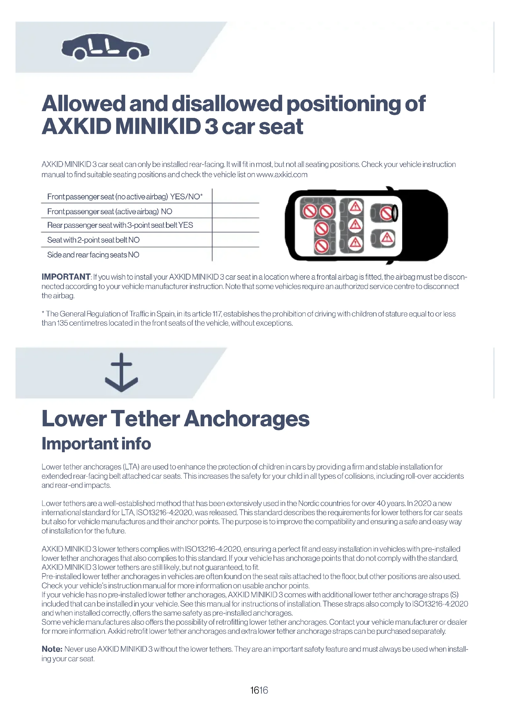 - The General Regulation of Trac in Spain, in its article 117, establishes the prohibition of driving with children of stature equal to or less than 135 centimetres located in the front seats of the vehicle, without exceptions. Lower Tether Anchorages Important info Lower tether anchorages (LTA) are used to enhance the protection of children in cars by providing a rm and stable installation for extended rear-facing belt attached car seats. This increases the safety for your child in all types of collisions, including roll-over accidents and rear-end impacts. Lower tethers are a well-established method that has been extensively used in the Nordic countries for over 40 years. In 2020 a new international standard for LTA, ISO13216-4:2020, was released. This standard describes the requirements for lower tethers for car seats but also for vehicle manufactures and their anchor points. The purpose is to improve the compatibility and ensuring a safe and easy way of installation for the future. AXKID MINIKID 3 lower tethers complies with ISO13216-4:2020, ensuring a perfect t and easy installation in vehicles with pre-installed lower tether anchorages that also complies to this standard. If your vehicle has anchorage points that do not comply with the standard, AXKID MINIKID 3 lower tethers are still likely, but not guaranteed, to t. Pre-installed lower tether anchorages in vehicles are often found on the seat rails attached to the oor, but other positions are also used. Check your vehicle’s instruction manual for more information on usable anchor points. If your vehicle has no pre-installed lower tether anchorages, AXKID MINIKID 3 comes with additional lower tether anchorage straps (S) included that can be installed in your vehicle. See this manual for instructions of installation. These straps also comply to ISO13216-4:2020 and when installed correctly, oers the same safety as pre-installed anchorages. Some vehicle manufactures also oers the possibility of retrotting lower tether anchorages. Contact your vehicle manufacturer or dealer for more information. Axkid retrot lower tether anchorages and extra lower tether anchorage straps can be purchased separately. Note: Never use AXKID MINIKID 3 without the lower tethers. They are an important safety feature and must always be used when install- ing your car seat.17 Installing lower tether anchorage straps If your vehicle has no suitable pre-installed lower tether anchorages, AXKID MINIKID 3 comes with lower tether anchorage straps that can be installed in your vehicle. Depending on your vehicle and the seat position where you choose to install your car seat, there are various possible anchorage points to use for installing the anchorage straps. See below for alternatives. To install the lower tether anchorage straps (S), simply route the strap around the chosen anchorage point and thread the metal anchorage through one of the slots on the strap itself. The anchorage strap has several slots to use. Make sure to use the slot as close as possible to the metal anchorage, thus installing the metal anchorage as close to the vehicle oor as possible. Once this is done, pull on the metal anchorage to tighten the strap and repeat the process for the other strap. Always use two anchorage points when installing AXKID MINIKID 3 and choose anchorage points that are separated as this gives a more stable installation. Anchorage strap routing options alt. a Route the strap around the edge of the pre-installed anchorage (use this method only if the pre-installed anchorages do not t with the lower tethers directly) alt. b Install the strap around the seat rail in front of the car seat by threading the strap between the seat rail and vehicle oor or through appropriate hole of the seat rail. alt. c Install the strap around the hinge of the vehicle seat in front of the car seat by threading the strap in between the vehicle seat back and seat cushion. alt. d Install the strap around the seat rail below the car seat by threading the strap between the seat rail and vehicle oor or through appropriate hole of the seat rail. alt. e When installing the AXKID MINIKID 3 in a front passenger seat and none of above alternatives is available, it is possible to attach the lower tether anchorage straps to a suitable anchorage point in the back of the vehicle and rout the straps underneath the vehicle seat to the front of the vehicle. Make sure that the anchorage straps comes out from the front of the seat and not out from the sides. Note: Always make sure that changing the position of any vehicle seat does not interfere or damage the installed lower tether anchorage straps Note: Never use sharp objects to assist in routing the straps as it might damage the strap.