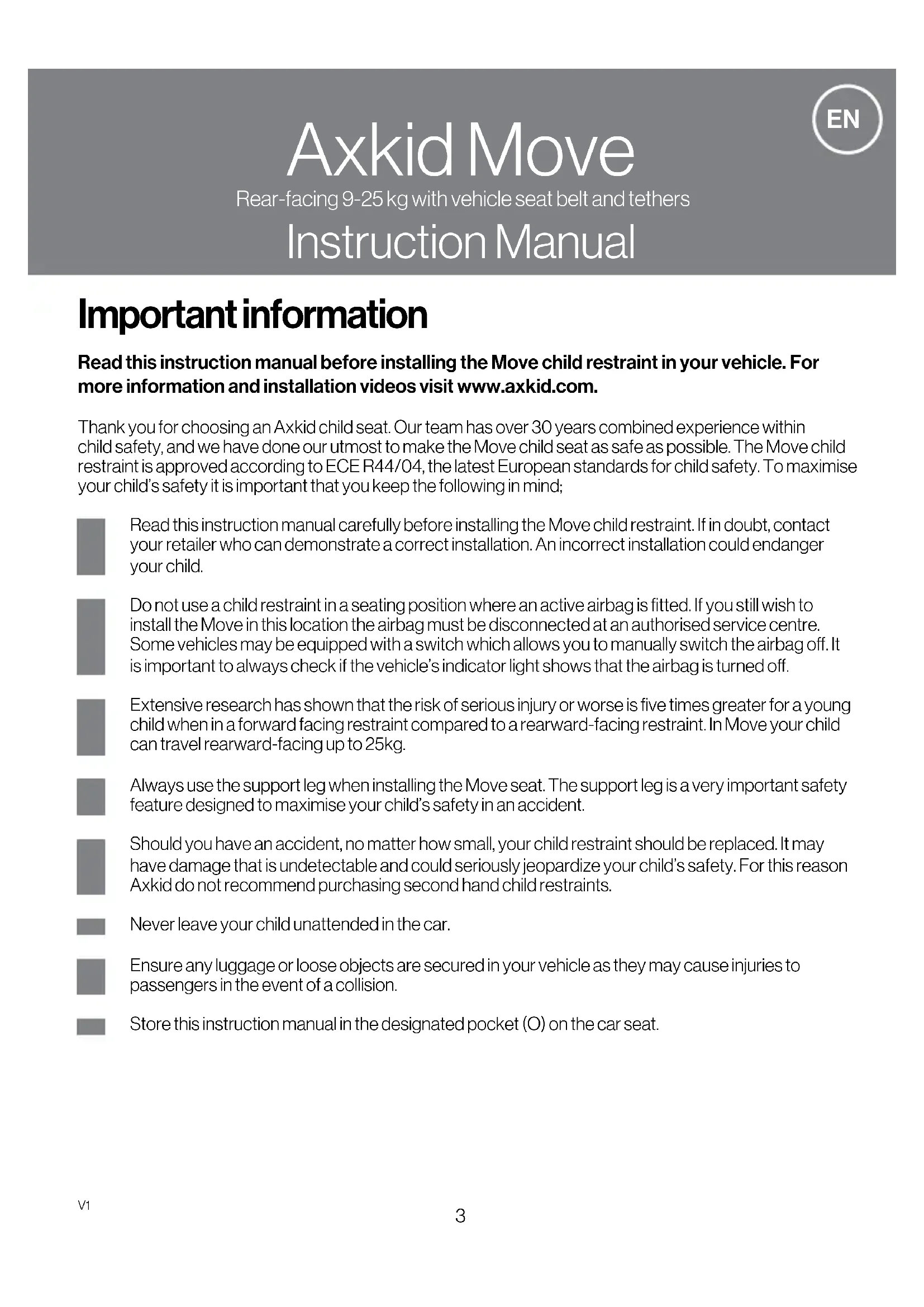 Instruction Manual Rear-facing 9-25 kg with vehicle seat belt and tethers Read this instruction manual carefully before installing the Move child restraint. If in doubt, contact your retailer who can demonstrate a correct installation. An incorrect installation could endanger your child.Do not use a child restraint in a seating position where an active airbag is fitted. If you still wish to install the Move in this location the airbag must be disconnected at an authorised service centre. Some vehicles may be equipped with a switch which allows you to manually switch the airbag o. It is important to always check if the vehicle’s indicator light shows that the airbag is turned o.Extensive research has shown that the risk of serious injury or worse is five times greater for a young child when in a forward facing restraint compared to a rearward-facing restraint. In Move your child can travel rearward-facing up to 25kg.Always use the support leg when installing the Move seat. The support leg is a very important safety feature designed to maximise your child’s safety in an accident.Should you have an accident, no matter how small, your child restraint should be replaced. It may have damage that is undetectable and could seriously jeopardize your child’s safety. For this reason Axkid do not recommend purchasing second hand child restraints.Never leave your child unattended in the car.Ensure any luggage or loose objects are secured in your vehicle as they may cause injuries to passengers in the event of a collision.Store this instruction manual in the designated pocket (O) on the car seat.Read this instruction manual before installing the Move child restraint in your vehicle. For more information and installation videos visit www.axkid.com.Thank you for choosing an Axkid child seat. Our team has over 30 years combined experience within child safety, and we have done our utmost to make the Move child seat as safe as possible. The Move child restraint is approved according to ECE R44/04, the latest European standards for child safety. To maximise your child’s safety it is important that you keep the following in mind; Important information