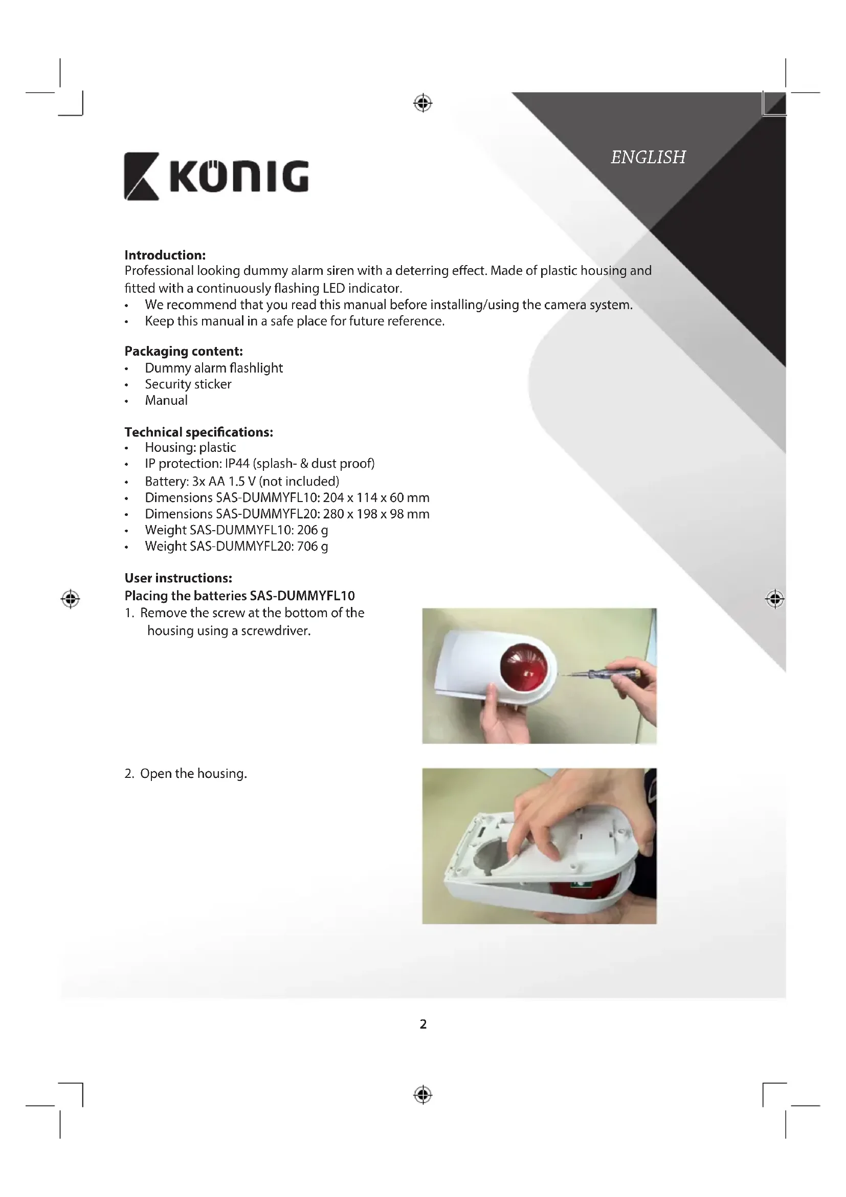 Download the instructions for your Alarm system in PDF format for free! Find your manual SASDUMMYFL20 - KONIG and take your electronic device back in hand. On this page are published all the documents necessary for the use of your device. SASDUMMYFL20 by KONIG.