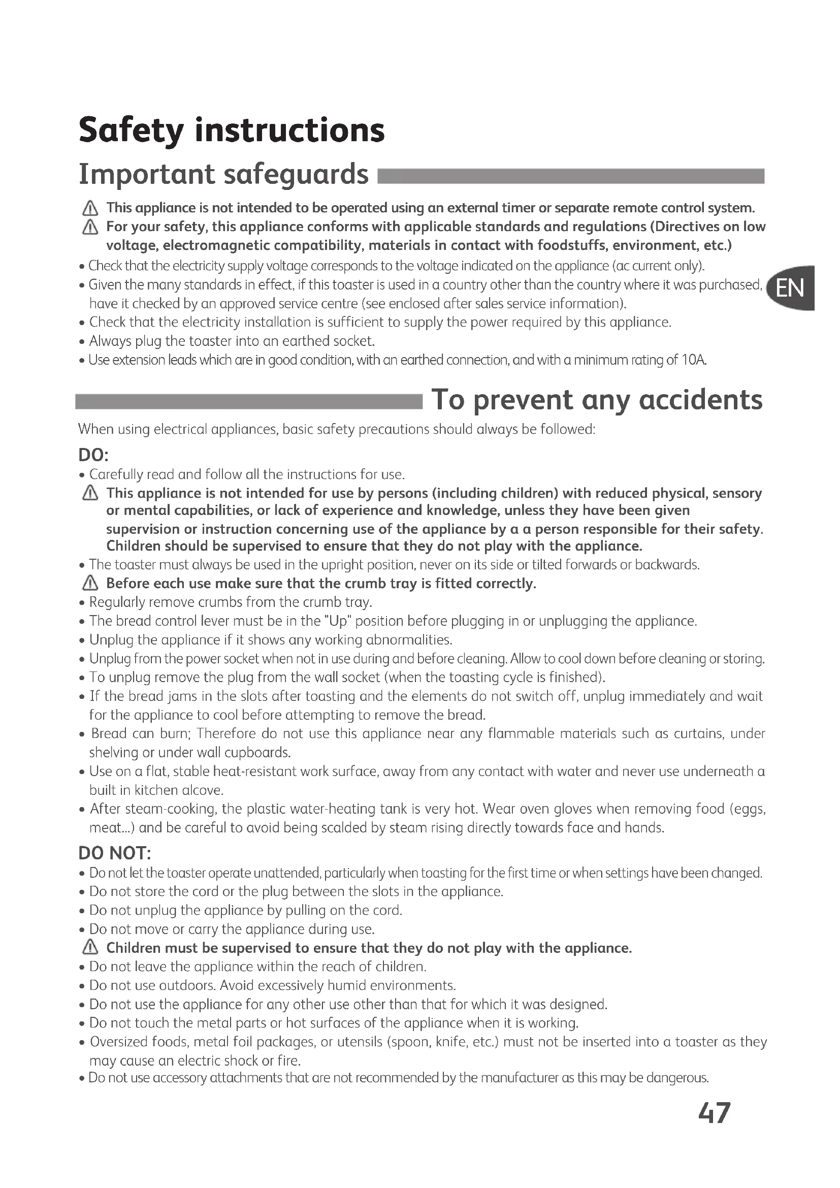 TOASTN'EGG-NC00013044:Mise en page 1 16/10/09 10:38 Page 46Safety instructions This appliance is not intended to be operated using an external timer or separate remote control system. For your safety, this appliance conforms with applicable standards and regulations (Directives on low voltage, electromagnetic compatibility, materials in contact with foodstuffs, environment, etc.)