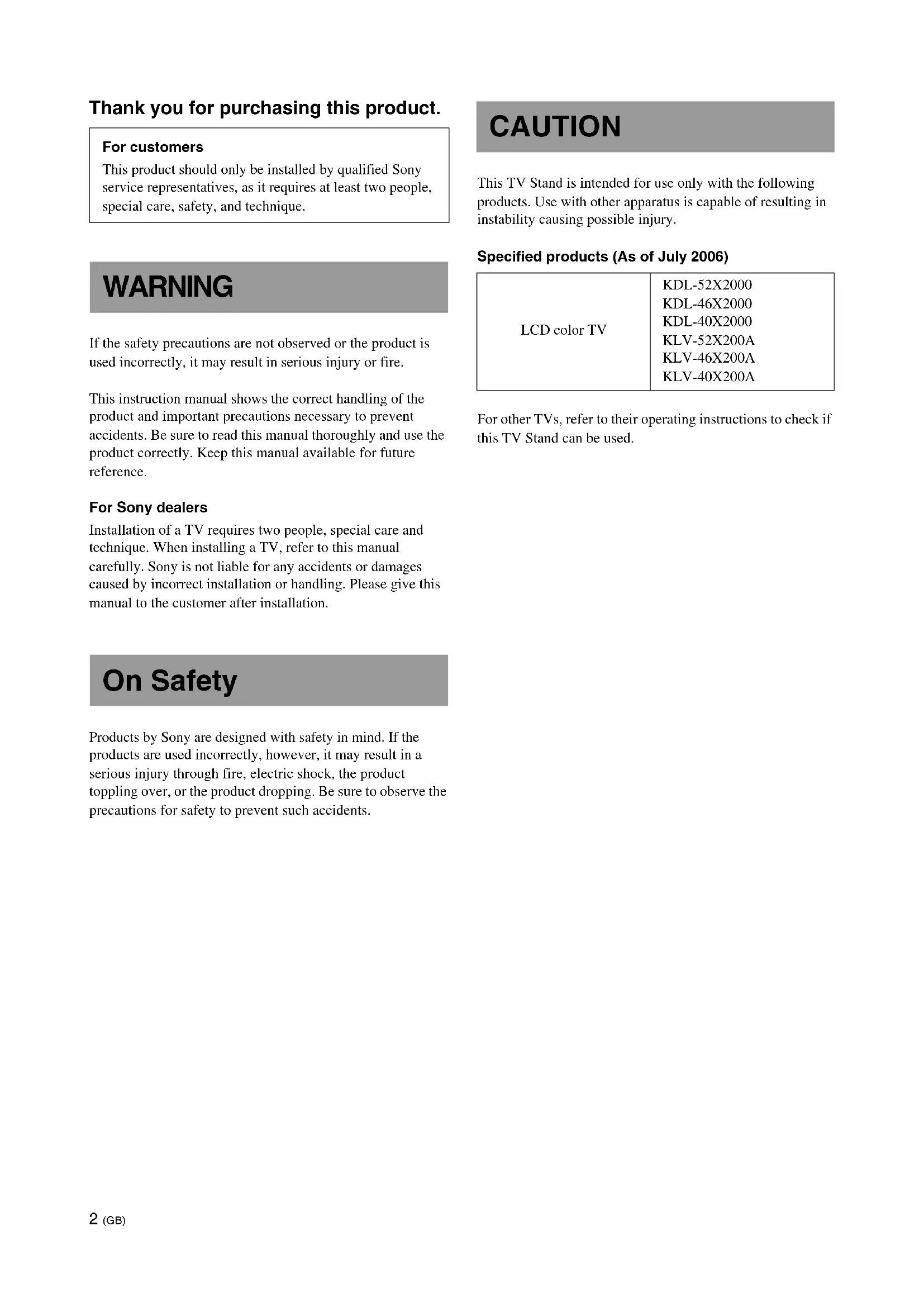 2-890-003-01 (1) OTF2 (GB) Thank you for purchasing this product. If the safety precautions are not observed or the product is used incorrectly, it may result in serious injury or fire. This instruction manual shows the correct handling of the product and important precautions necessary to prevent accidents. Be sure to read this manual thoroughly and use the product correctly. Keep this manual available for future reference. For Sony dealers Installation of a TV requires two people, special care and technique. When installing a TV, refer to this manual carefully. Sony is not liable for any accidents or damages caused by incorrect installation or handling. Please give this manual to the customer after installation. Products by Sony are designed with safety in mind. If the products are used incorrectly, however, it may result in a serious injury through fire, electric shock, the product toppling over, or the product dropping. Be sure to observe the precautions for safety to prevent such accidents. This TV Stand is intended for use only with the following products. Use with other apparatus is capable of resulting in instability causing possible injury. Specified products (As of July 2006) For other TVs, refer to their operating instructions to check if this TV Stand can be used. For customers This product should only be installed by qualified Sony service representatives, as it requires at least two people, special care, safety, and technique. WARNING On Safety CAUTION LCD color TV KDL-52X2000 KDL-46X2000 KDL-40X2000