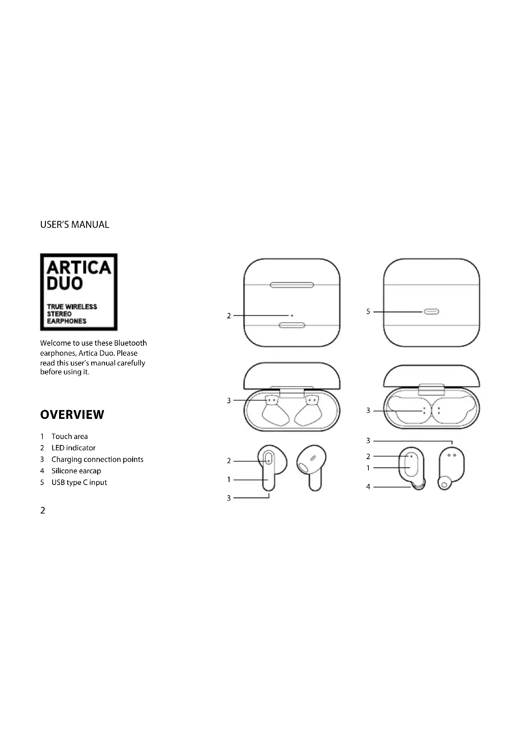 Welcome to use these Bluetooth earphones, Artica Duo. Please read this user’s manual carefully before using it. OVERVIEW Touch area LED indicator Charging connection points Silicone earcap USB type C input