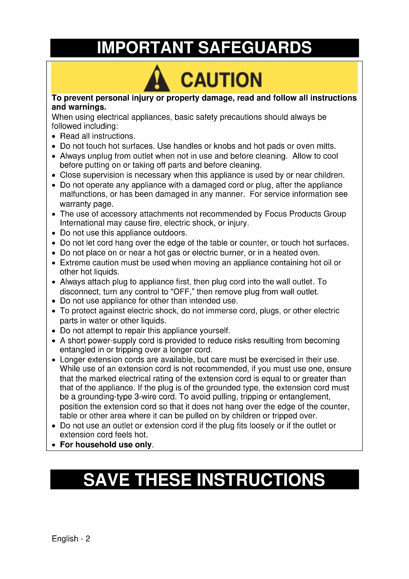 - The use of accessory attachments not recommended by Focus Products Group International may cause fire, electric shock, or injury.