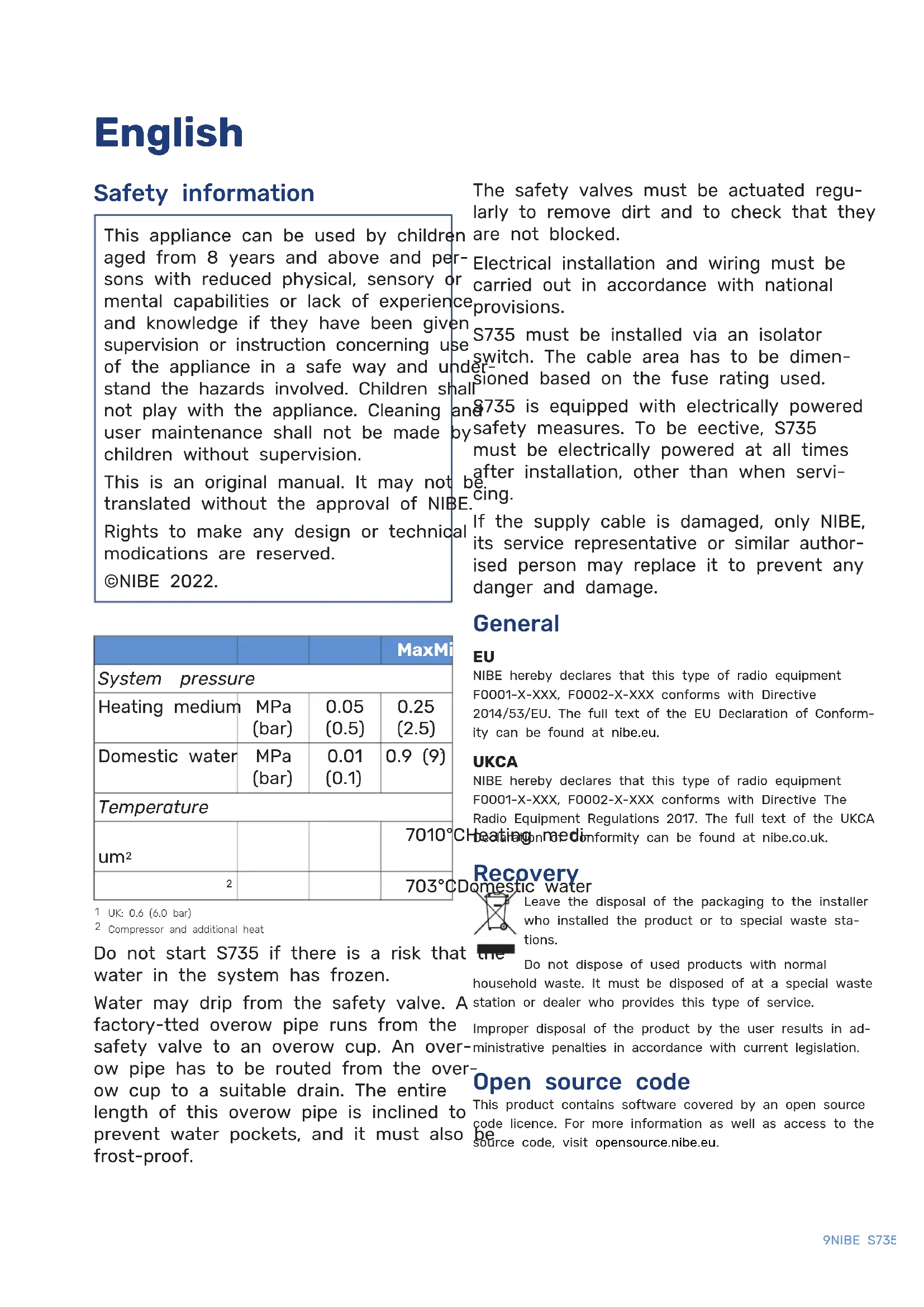 UK: 0.6 (6.0 bar) Compressor and additional heat Do not start S735 if there is a risk that the water in the system has frozen. Water may drip from the safety valve. A factory-fitted overflow pipe runs from the safety valve to an overflow cup. An over- flow pipe has to be routed from the over- flow cup to a suitable drain. The entire length of this overflow pipe is inclined to prevent water pockets, and it must also be frost-proof.